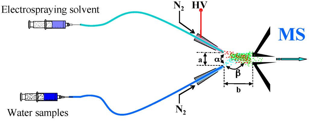 Experiments were carried out using a LTQ-XL mass spectrometer (Finnigan, San Jose, CA, USA) equipped with a home-made EESI source [21,22,23]. The EESI source and the LTQ mass spectrometer were set to work in positive-ion detection mode. MS spectra were recorded in the range of 50–500 m/z. The ESI voltage was set at 3.5 kV; the temperature of the ion-transport capillary was 400 °C; the injection rates of ESI solvent and sample solution was set at 3 μL·min−1 and 5 μL·min−1, respectively; high purity nitrogen gas (purity ≥ 99.999%) from a gas cylinder are used for nebulizing the ESI solvent (methanol; silica capillary, i.d. 0.1 mm) and sample solution (silica capillary, i.d. 0.1 mm); and the pressure was 1.4 MPa. The EESI assembly was mounted on a 3-D adjustable stage (shown in Figure 1). The distance (a) between the two channels of the EESI source and the distance (b) between the tips of the EESI source and the MS inlet were optimized to be 1 mm and 5 mm, respectively. The angle (α) between the two sprays and the angle (β) between individual sprays and the MS inlet were around 60° and 150°, respectively.