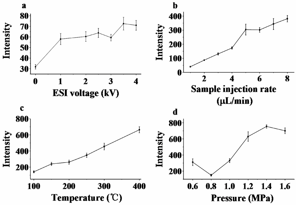 Variation of the signal intensity with the ESI voltage (a); sample injection rate (b); ion-transport capillary temperature (c); and nebulizing gas (N2) pressure (d).