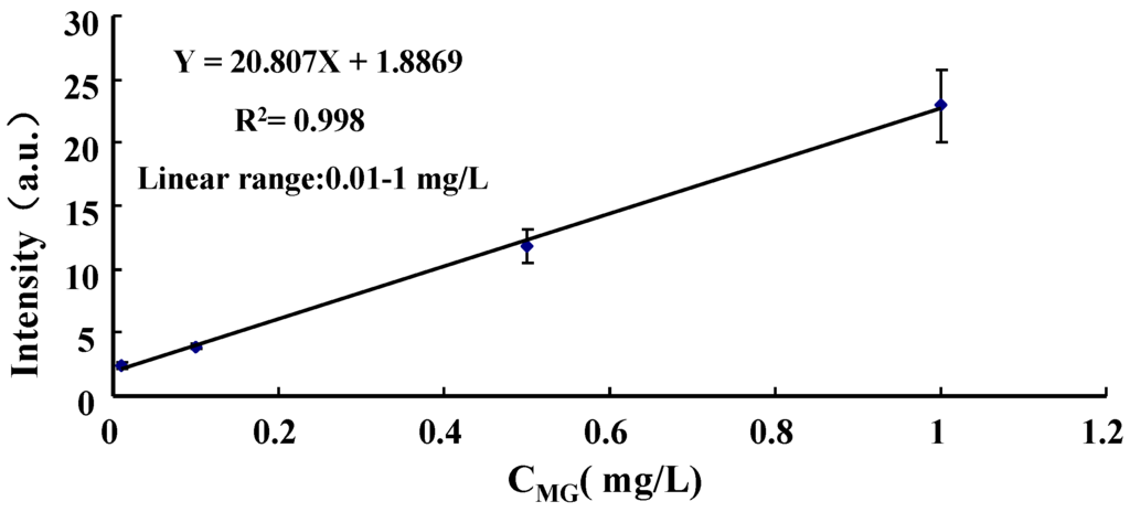 Dependence of the signal intensity on MG concentration in lake water.