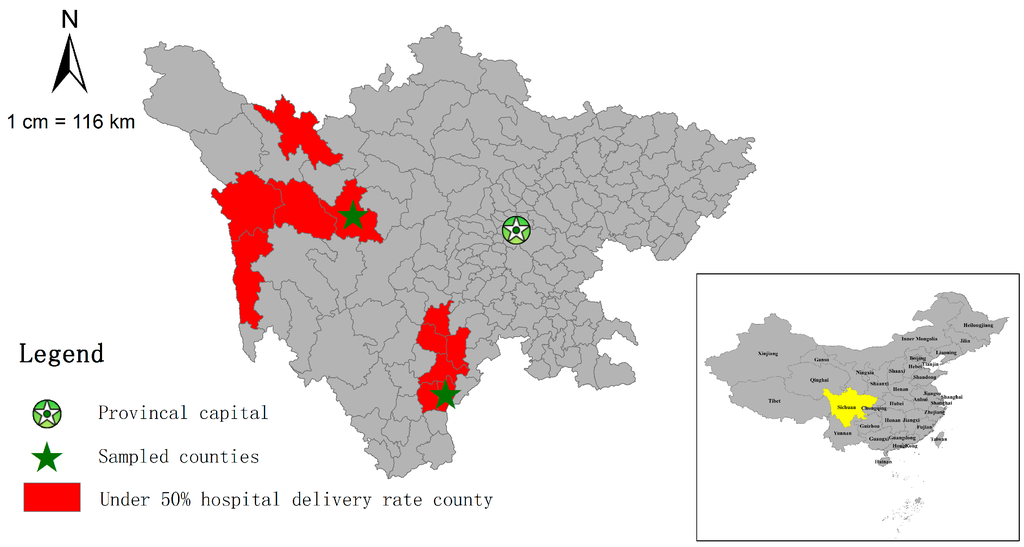 Despite such nationwide progress, the national maternal and child health (MCH) statistics annual report system (not publicly accessible), identifies some regions are still lagging behind. In 2011, there were 188 counties (6.6% of all counties) with a hospital delivery rate of less than 90%, and among them, 30 (1.0% of all counties) had rates below 50%. All of these were in the Tibet Autonomous Region and Sichuan Province. Nineteen of the 73 counties (26.0%) in Tibet had a hospital delivery rate below 50%. Some studies show that inequity also exists in some subgroups of populations, such as low-income households, rural women, and ethnic minorities []. Eleven of the 181 counties in Sichuan (6.1%) had a hospital delivery rate below 50%, demonstrating the inequality gap in this province since the average rate for the whole Sichuan Province was as high as 92.5%. These 11 counties were located in the west rural ethnic minority areas of Sichuan Province (Figure 1). Sichuan Province is in Southwest China covering 485,000 square kilometers and occupying 5.1% of the total area of China. It is also where 55 of the all 56 ethnic minorities in China reside []. According to the sixth National Population Census in November 2010, the total population of Sichuan Province was 80,418,200, which made it the fourth most populous province in China [].