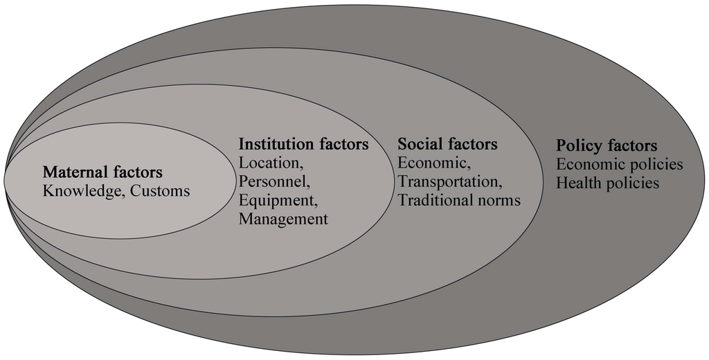 Developing specific in-depth local strategies for the regions is of importance with low hospital delivery coverage []. There are numerous factors affecting the utilization of maternal care including maternal, family and social factors, policy interventions, and health facility factors [,,]. While there are studies analyzed the demanding factors [,], understanding remains limited for social and provision factors.