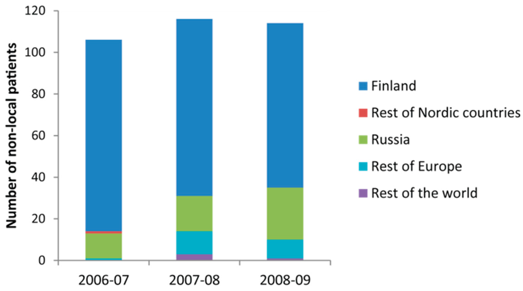 The answers of the questionnaires revealed that the Russians were mentioned as the largest group of foreigners. Two other categories were also mentioned: children on school trips and Finnish tourists during their winter holidays. It also was estimated that travellers accounted for about one third of emergency patients in summer and even more in winter.