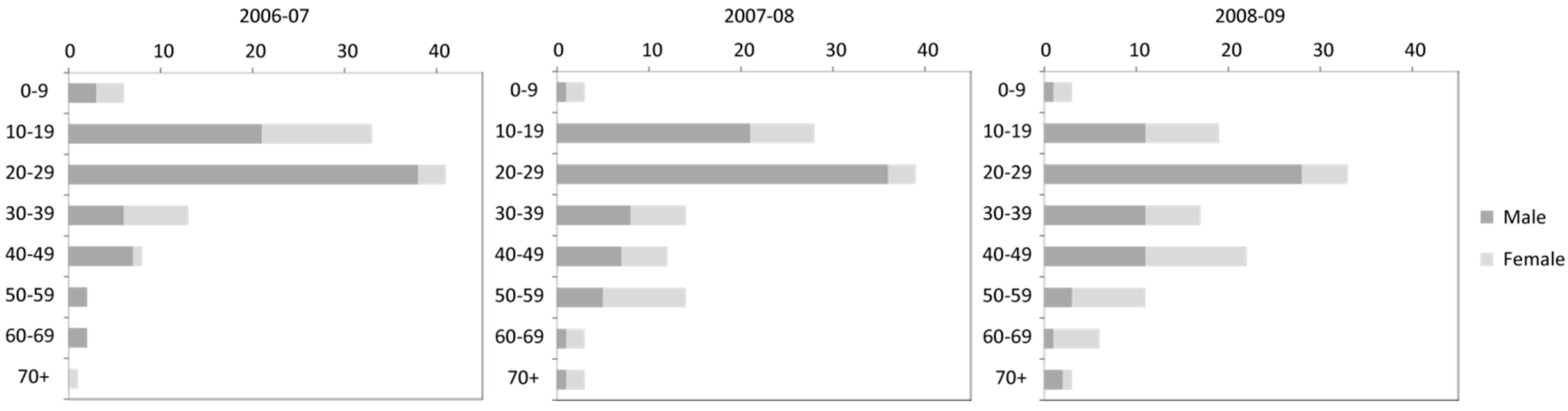 From the interviews and statistical data (Figure 2), the risk age category that was the most likely to experience an extremity injury were those in the 10–29 years old category, mostly boys and young men. With respect to elderly patients, it was more likely to be a woman and it was noted that there had been an increase in the numbers of visits to the emergency service by more elderly individuals for extremity injuries.