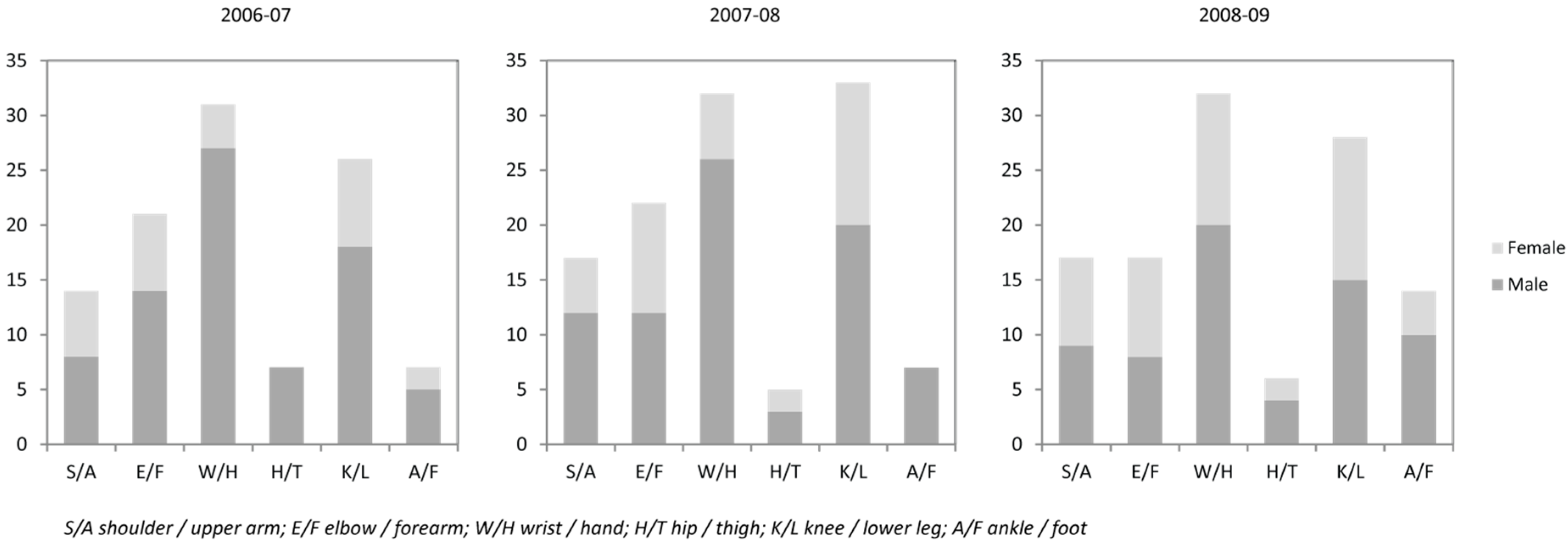 The time frame when fractures occurred was said to be widened because of the use of pipe (one type of snowboarding), but the actual numbers of fractures had not necessarily increased. Figure 3 shows that the typical injuries concerned mostly the wrist and hand and knee and lower leg.