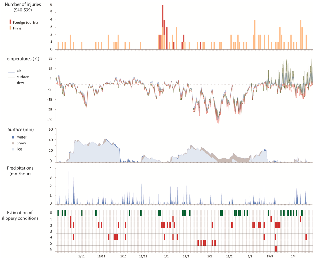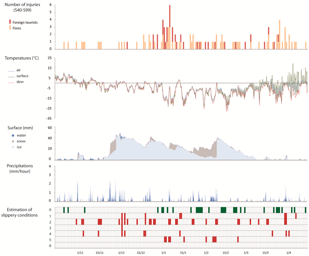 In order to formulate the objectives of this study, some prerequisites need to be specified. First of all, tourism is a major part of the local economy and good tourist resorts have to provide not only accommodation and outdoor facilities but also to ensure safety and healthcare [38]. Second, winter-sports and other outdoor activities in Finland are climate-dependent and therefore vulnerable to meteorological variations [38,39]. The main objective of this study was to focus on the impacts of the variability of weather conditions on the health of tourists assessed via documented accidents occurring during the winter season in the Sotkamo tourist area. We attempted to estimate the slipping hazard exposures in a specific context of space (tourist centre) and time (winter season) and we have focused not only on the weather but also other relevant parameters (e.g., holidays, seasonal variations) which could be responsible for any increases in the numbers of injuries and accidents. This is the first study to investigate all-aged tourists’ health and to combine weather data with different types of injuries.