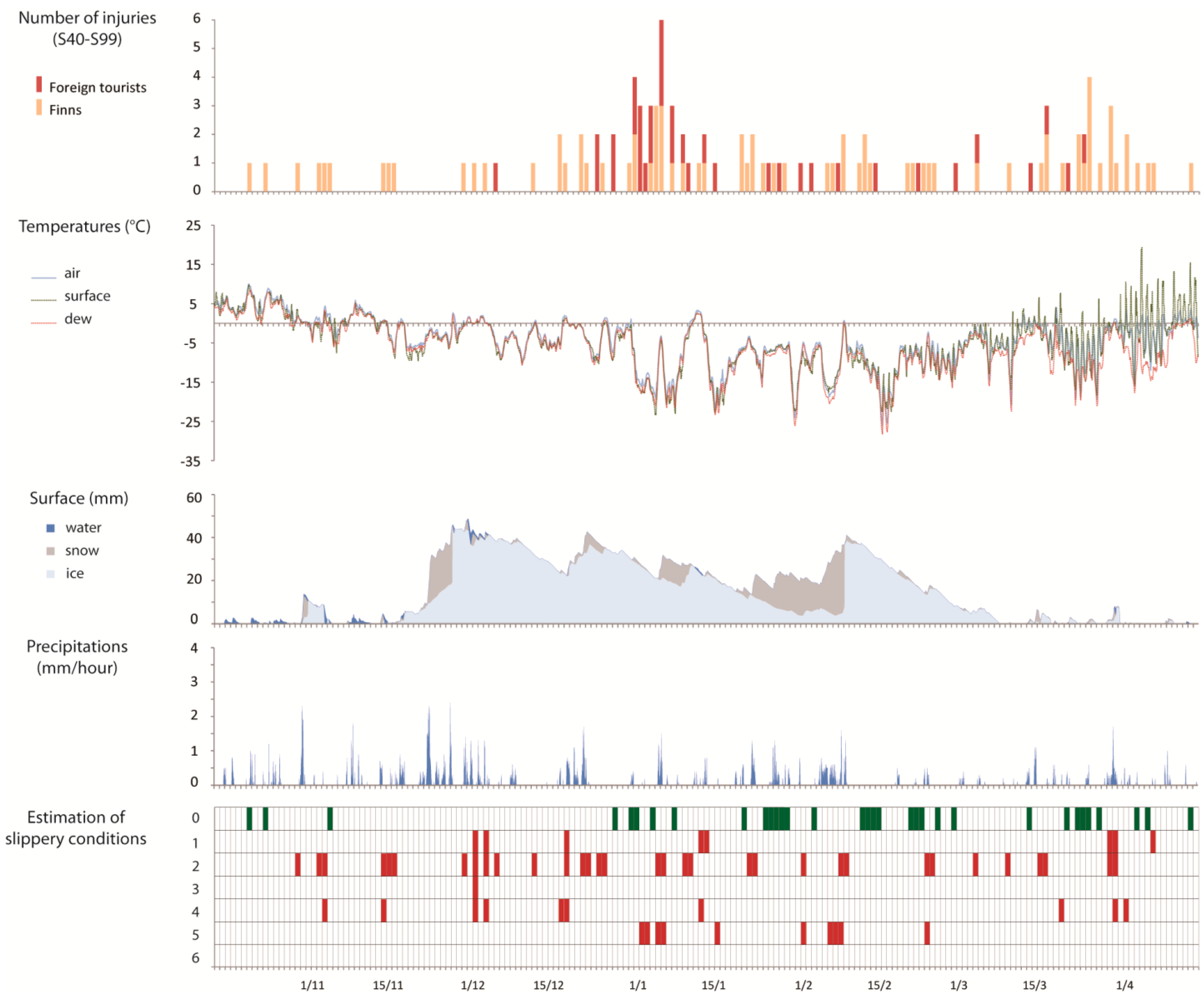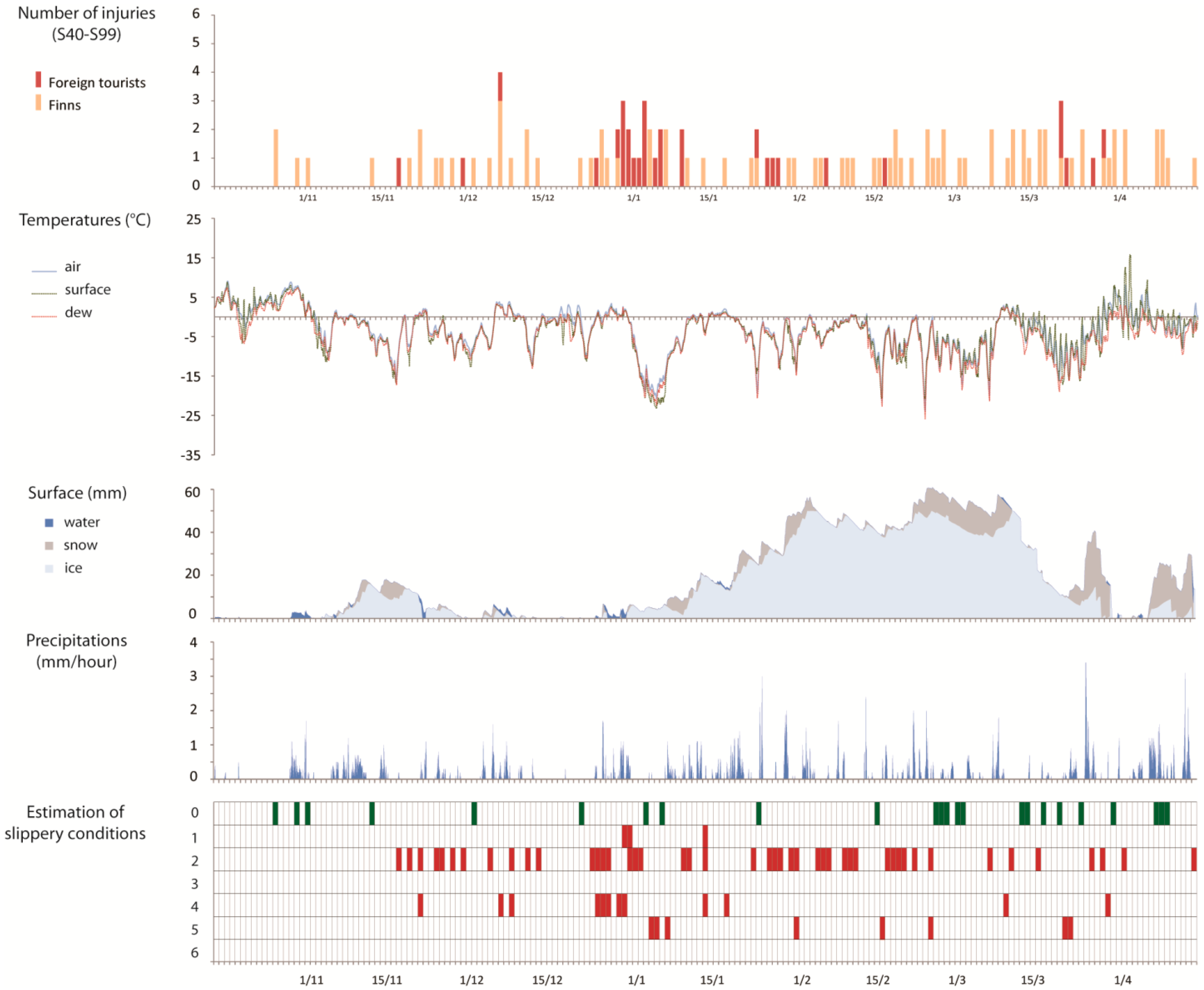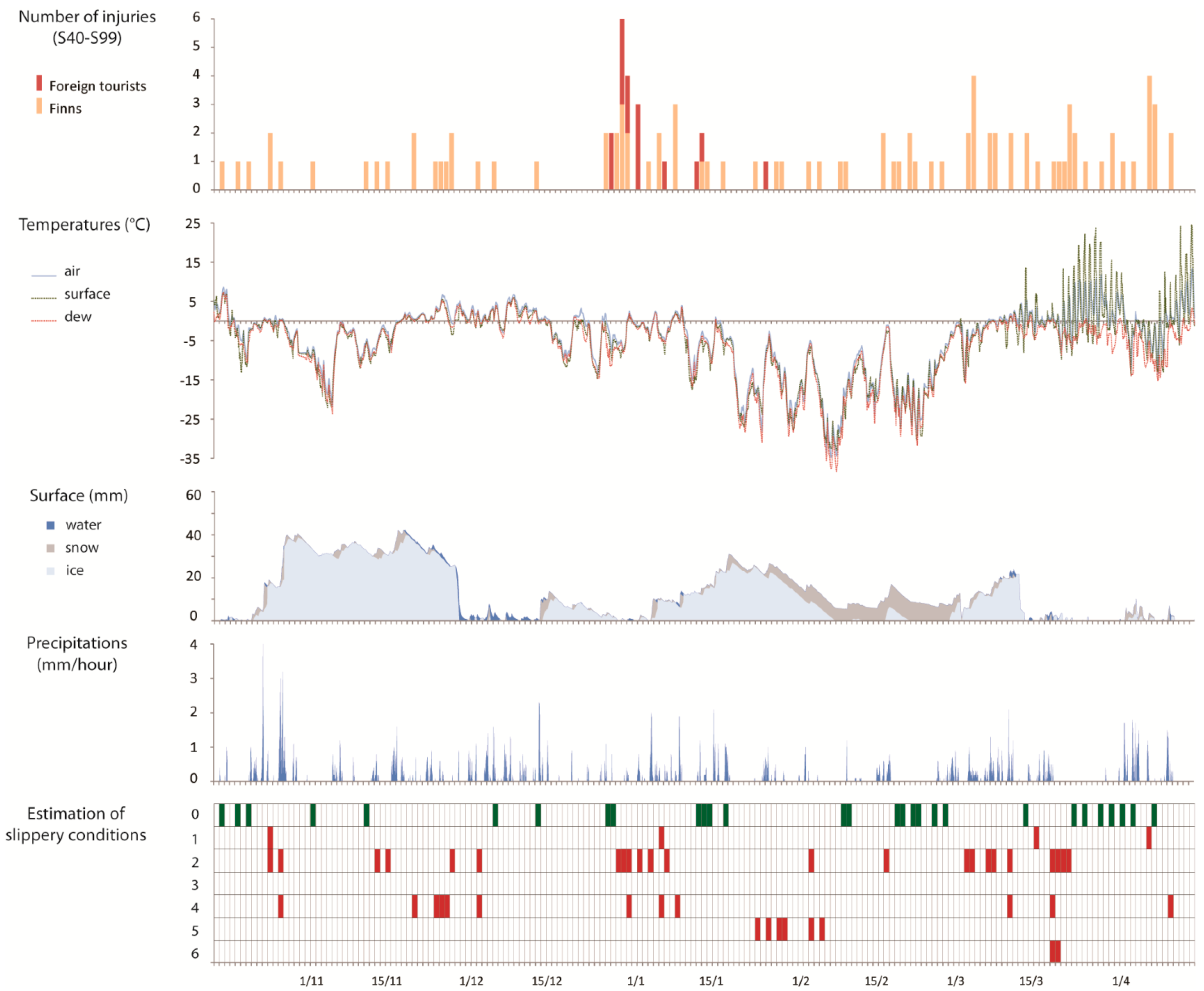 The study population consisted of injured tourists. We received ethical permission to access the data of non-local health service users from Kainuu Hospital. This study focuses on the patients who were injured in the following parts of the body: shoulder and upper arm (S40–S49 according to the ICD-10 diagnosis codes), elbow and forearm (S50–S59), wrist and hand (S60–S69), hip and thigh (S70–S79), knee and lower leg (S80–S89) and ankle and foot (S90–S99). We assume that the above-mentioned extremity injuries most commonly occur after slips and falls. The data was extracted for three winter seasons from 15 October to 15 April of 2006/2007, 2007/2008 and 2008/2009.