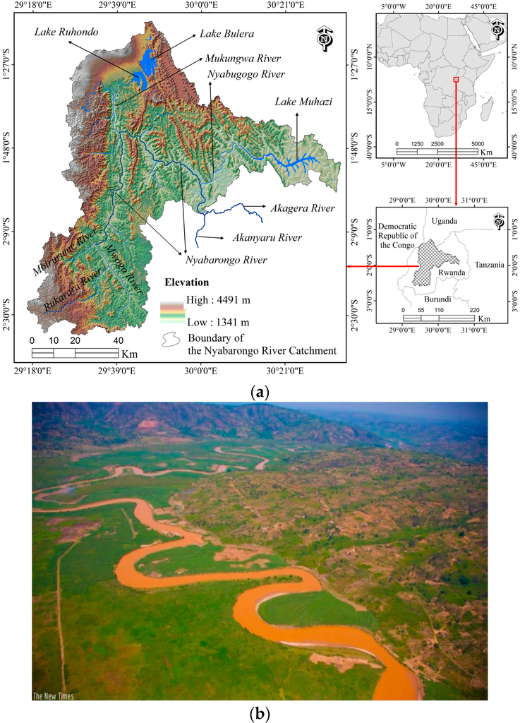 (a) Location map of the Nyabarongo River Catchment; and (b) an aerial view of the Nyabarongo River, with the water looking muddy brown due to pollution [26].