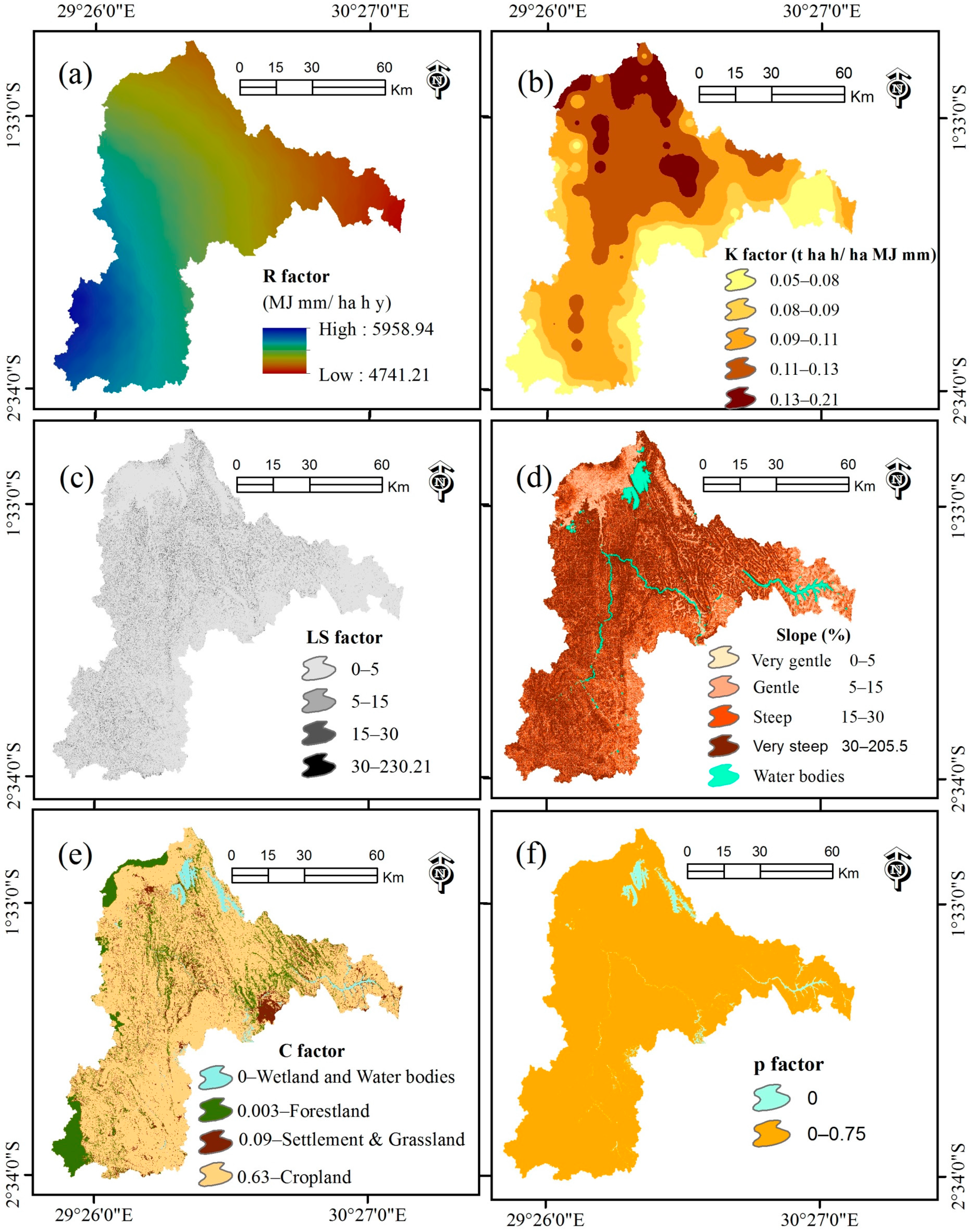 Maps of the Universal Soil Loss Equation (USLE) factors for the Nyabarongo River Catchment: (a) rainfall erosivity; (b) soil erodibility; (c) slope length and slope steepness; (d) the Slope angle; (e) land cover management; (f) conservation support practice.