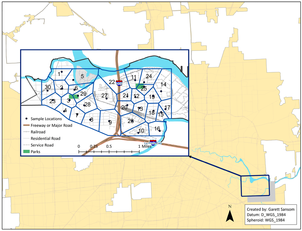 The community meeting with TEJAS and the Green Ambassadors allowed for local knowledge to help pinpoint locations that residents have noticed following rainfalls by offering the physical address or general location of problem areas. The neighborhood was partitioned into 30 separate clusters using the Thiessen polygon technique in ArcGIS (ESRI, Redlands, CA, USA) from the GPS locations and water sampling was conducted within each cluster (Figure 1).