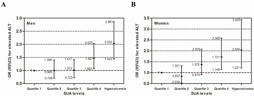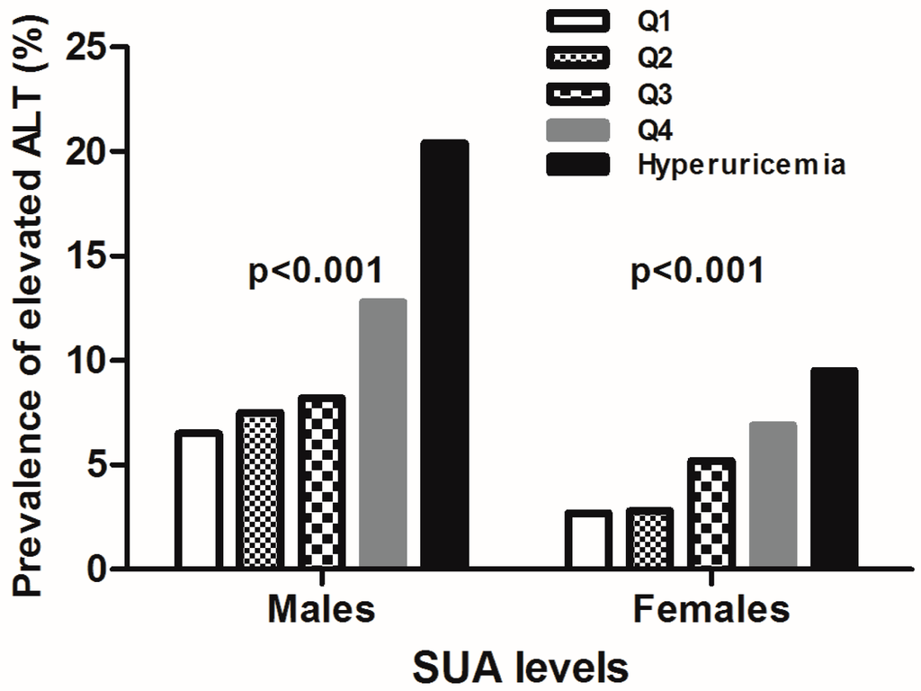 As shown in Figure 1, among both men and women, the prevalence of elevated ALT increased with an increment in the SUA level (p < 0.001). The proportions of elevated ALT from quartiles 1–4 of normal SUA to hyperuricemia were 6.5%, 7.5%, 8.2%, 12.8% and 20.4% for men, 2.7%, 2.8%, 5.2%, 6.9% and 9.5% for women, respectively. Among subjects in the fourth quartile and the hyperuricemia group, approximately 33.2% men and 16.4% women had elevated ALT. In addition, data showed that men had a higher prevalence of elevated ALT than women in all of the SUA categories.