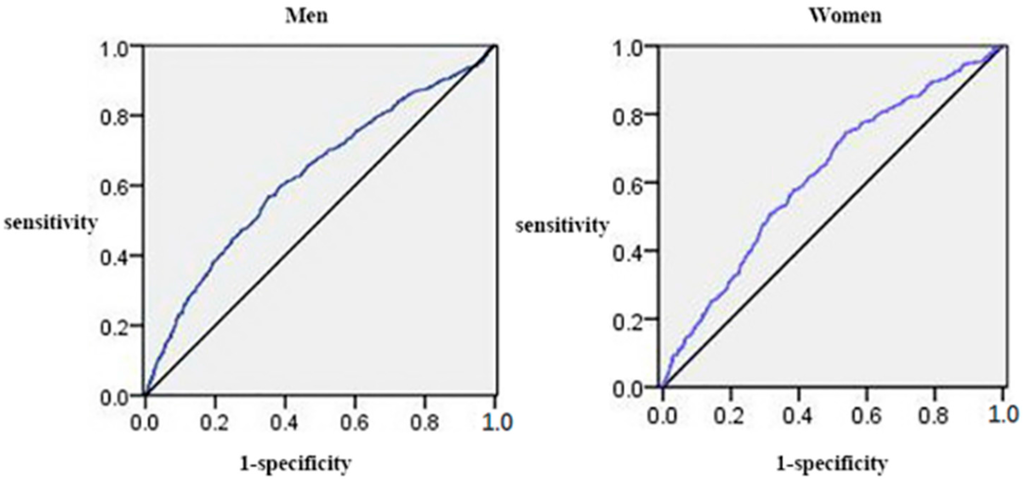 Elevated ALT was positively and significantly correlated with SUA in both genders (Figure 3). The discriminatory power of SUA in the prediction of elevated ALT was detected in both sexes (AUC: 0.627, 95% CI: 0.602–0.653 for men; AUC: 0.621, 95% CI: 0.588–0.653 for women).