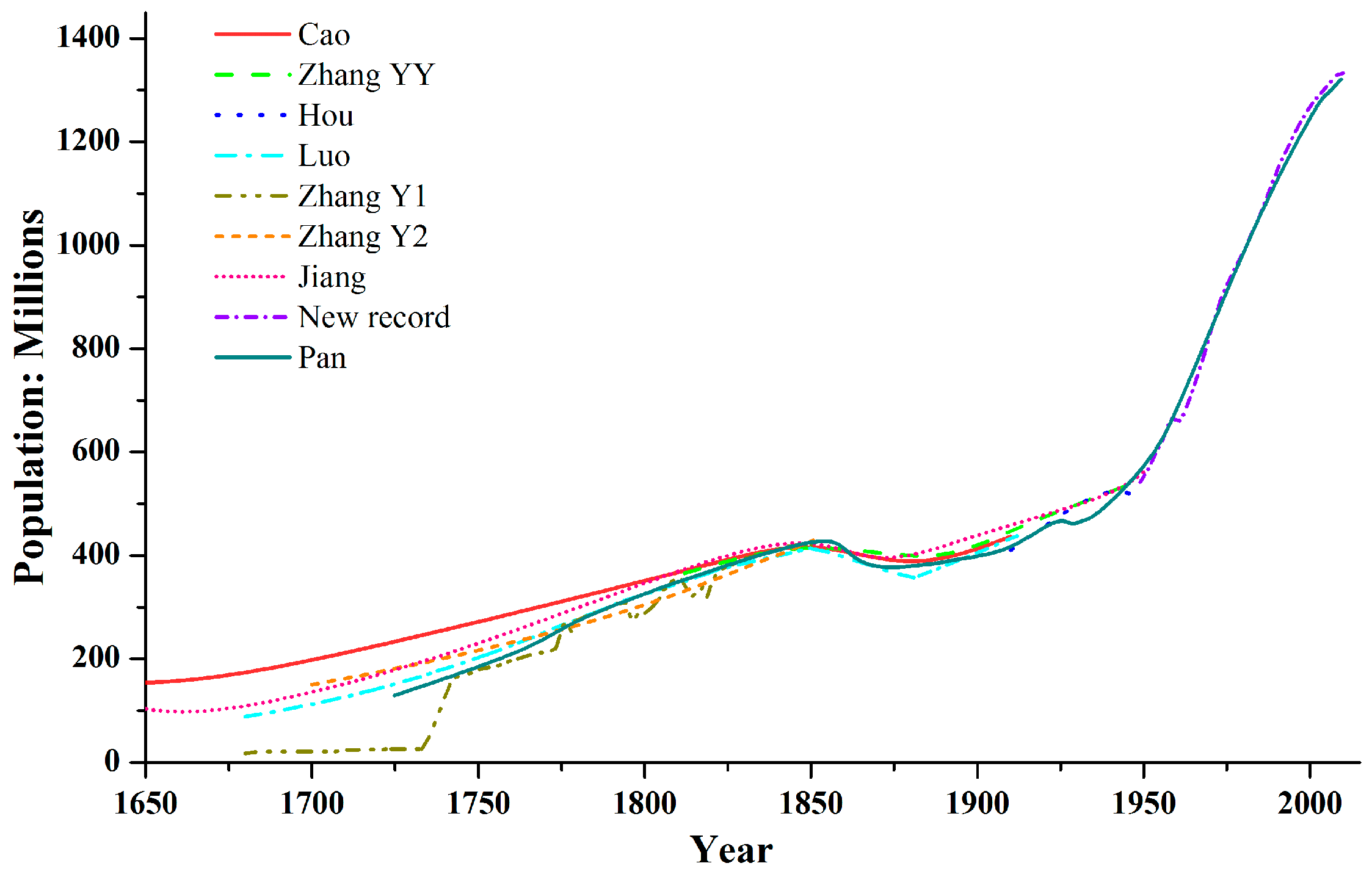 Historical changes of the population. Data resources: Cao [16], Zhang Y.Y. [17], Hou [18], Luo [19], Zhang Y1 & Y2 [20], Jiang [21]; New record: the Statistics of the Official Population in China since 1949, Pan [15].