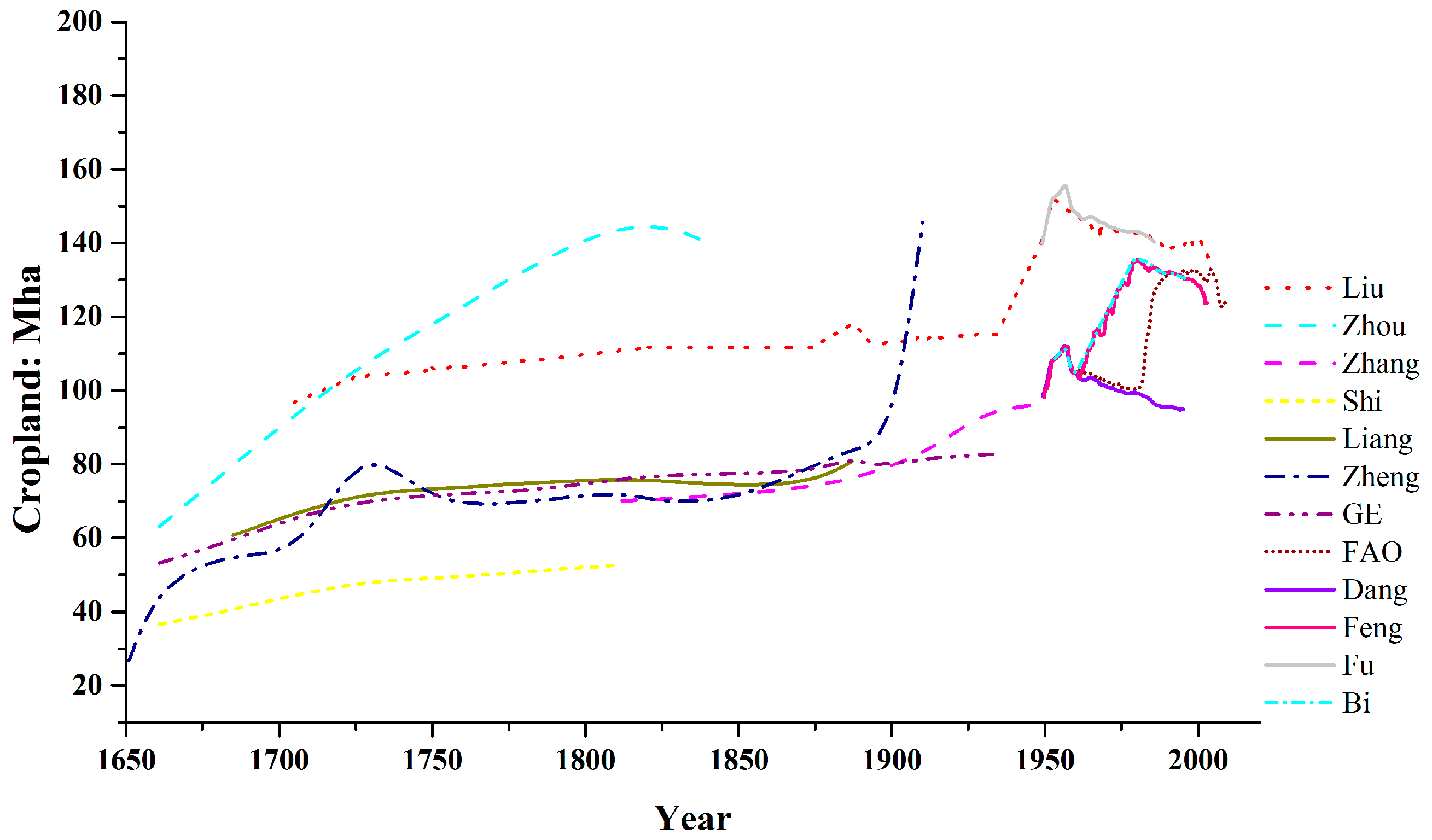 Various published estimates on cropland area are plotted in Figure 2. The cropland statistics are less consistent between datasets than population. Here we preferred a study based on 3 northeastern and 18 other provinces in China [11,13] for cropland variation during the Qing dynasty and the Republican period (that is, prior to 1949). This data is highly continuous and close to the median of the different datasets (Figure 2). After 1949 we took governmental statistics on cropland area [22].