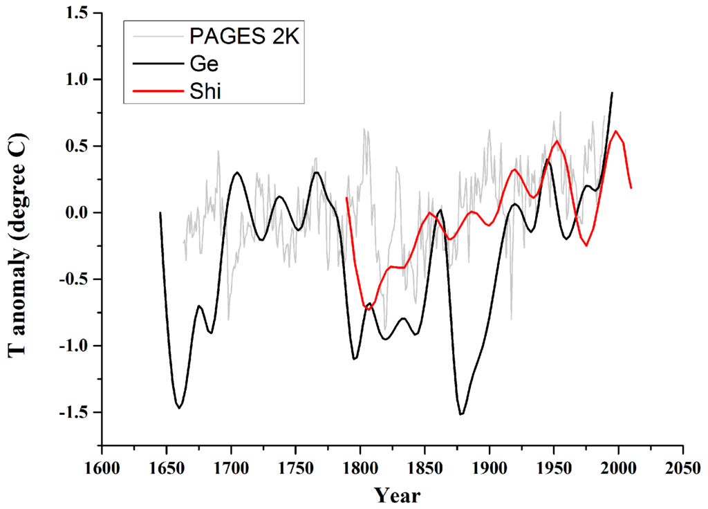 Figure 3. Temperature anomaly reconstructions: PAGES 2K representing Asian temperature [35]; Ge representing central and eastern China winter half-year temperatures based on historical archives [36]; Shi representing southeastern Tibetan Plateau summer minimum temperature [37].