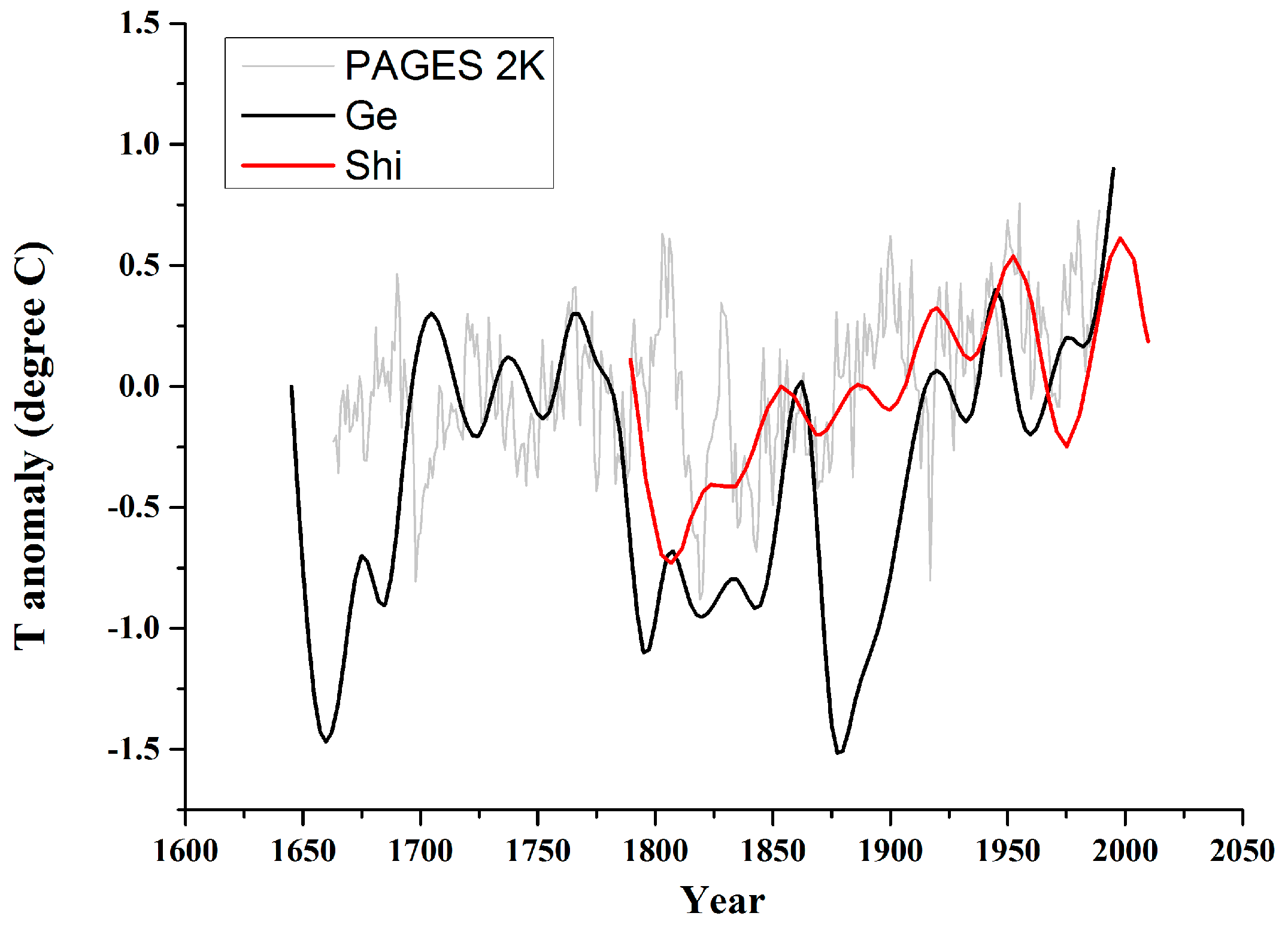 Temperature anomaly reconstructions: PAGES 2K representing Asian temperature [35]; Ge representing central and eastern China winter half-year temperatures based on historical archives [36]; Shi representing southeastern Tibetan Plateau summer minimum temperature [37].