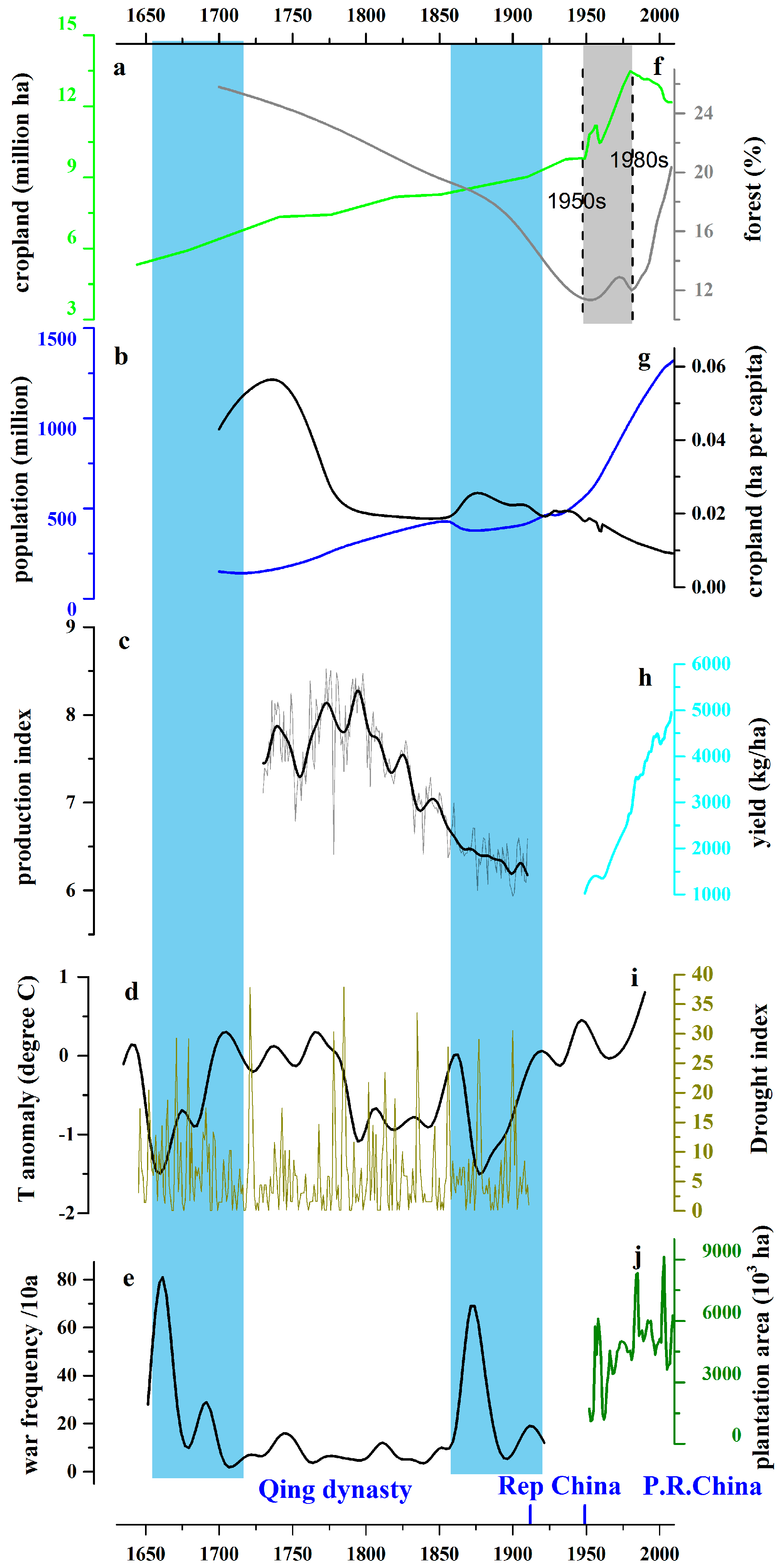Chinese land-use changes and associating factors during the past 300 years. (a): cropland area; (b): population; (c): production index (d): annual average temperature (e): decadal war frequency; (f): forest coverage rate; (g): cropland per capita; (h): yield since 1949; (i) Drought Index; (j) tree plantation area since 1949. The blue shadow sections indicate relatively cold periods, the grey shadow highlights the transition period. This figure was reused from Cui et al., 2015 [49].