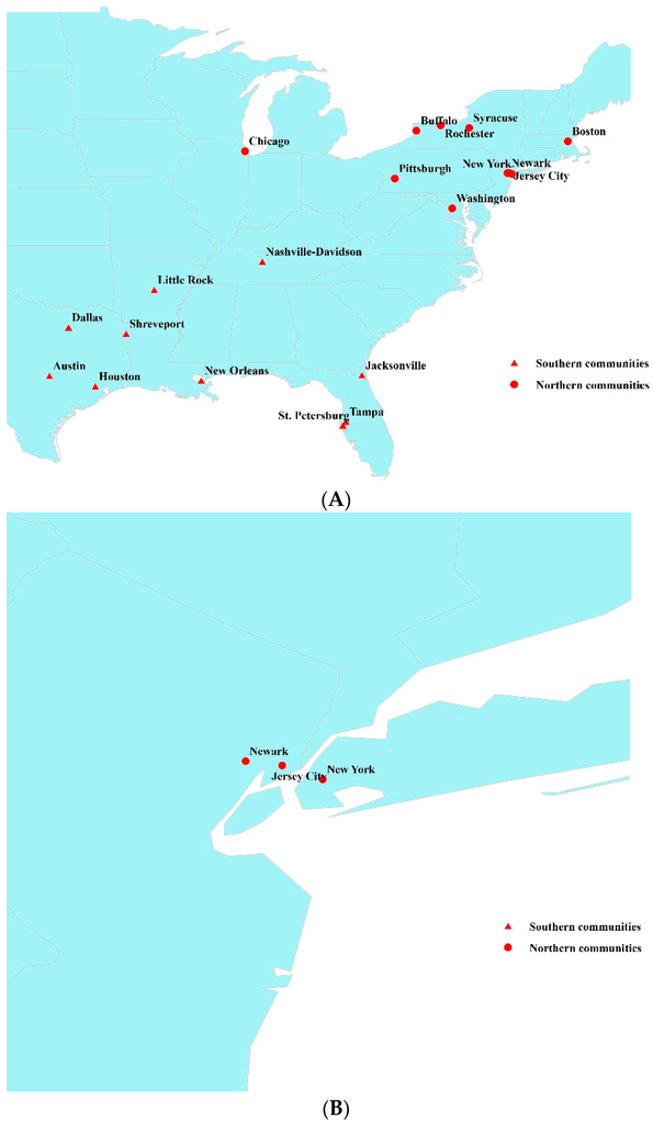 Distribution of 20 study communities in the USA. Note: This figure depicts the distribution of selected communities in the USA through ArcGis (ArcMap 9.3, Environmental Systems Research Institute, Redlands, CA, USA). (A): The distribution of all included communities; (B): The location of three northern communities that are located closely each other.