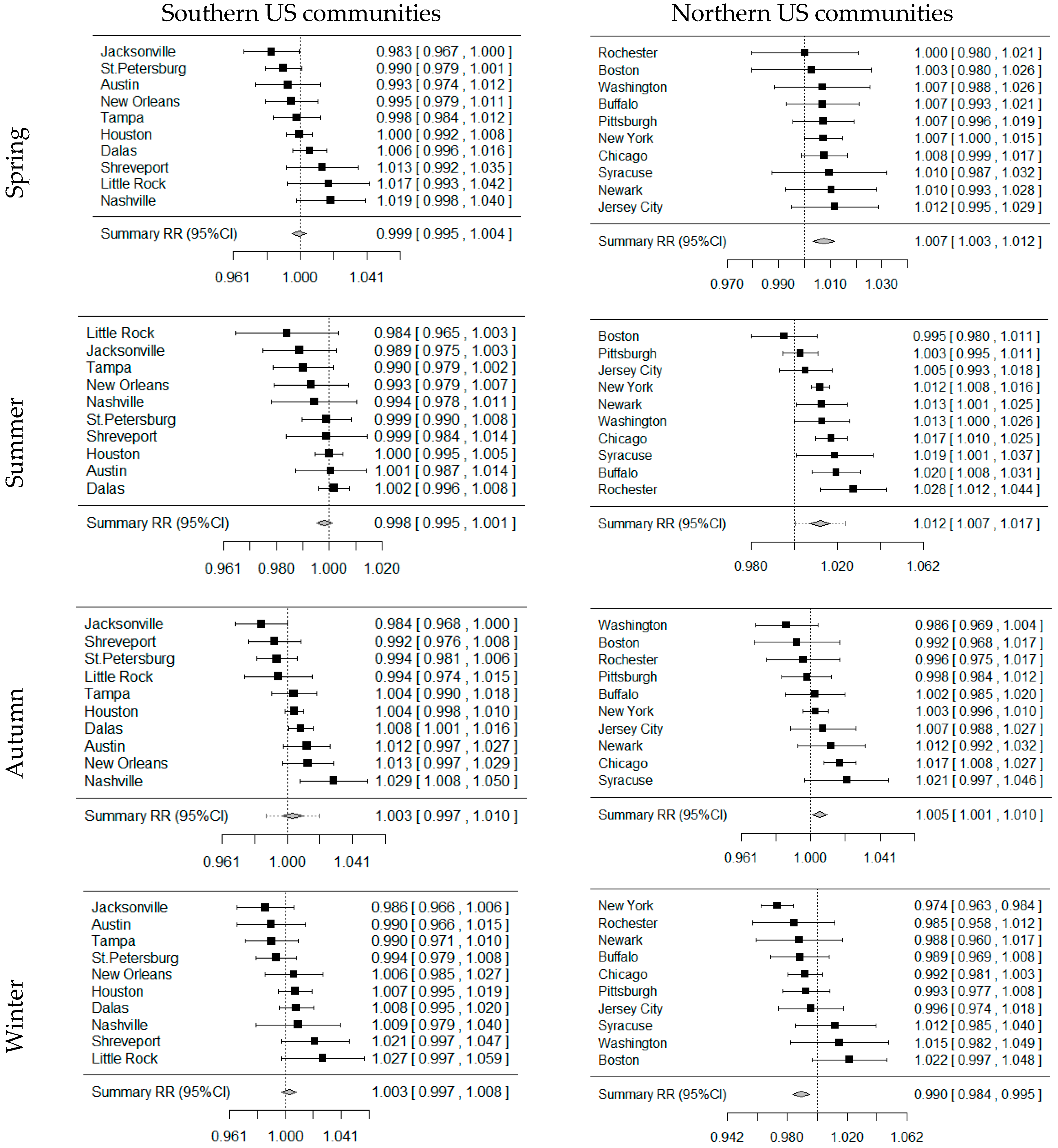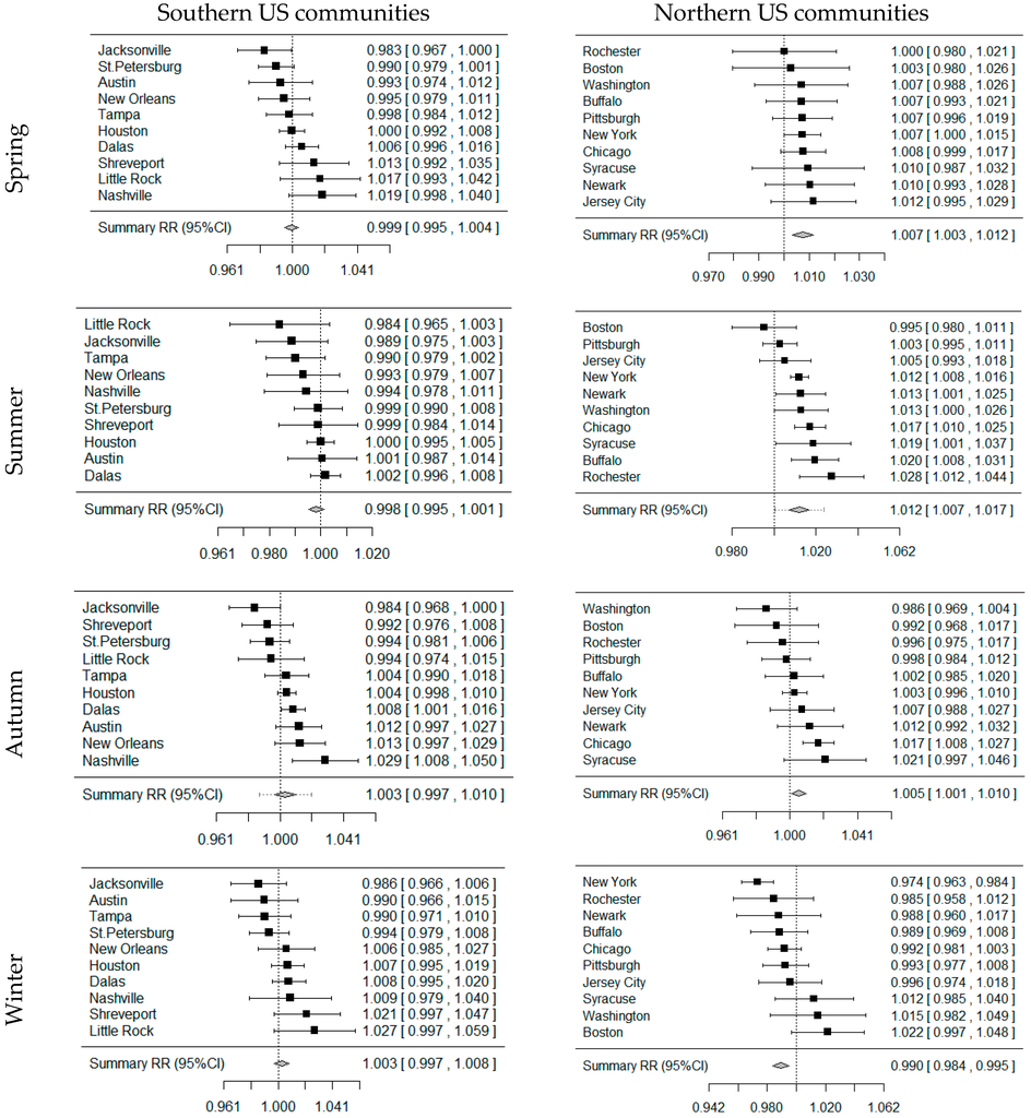 The summary effects of ambient ozone on mortality in each season of southern and northern US communities. Note: All results were adjusted for daily mean temperature (TM), time, day of week and relative humidity (RH).