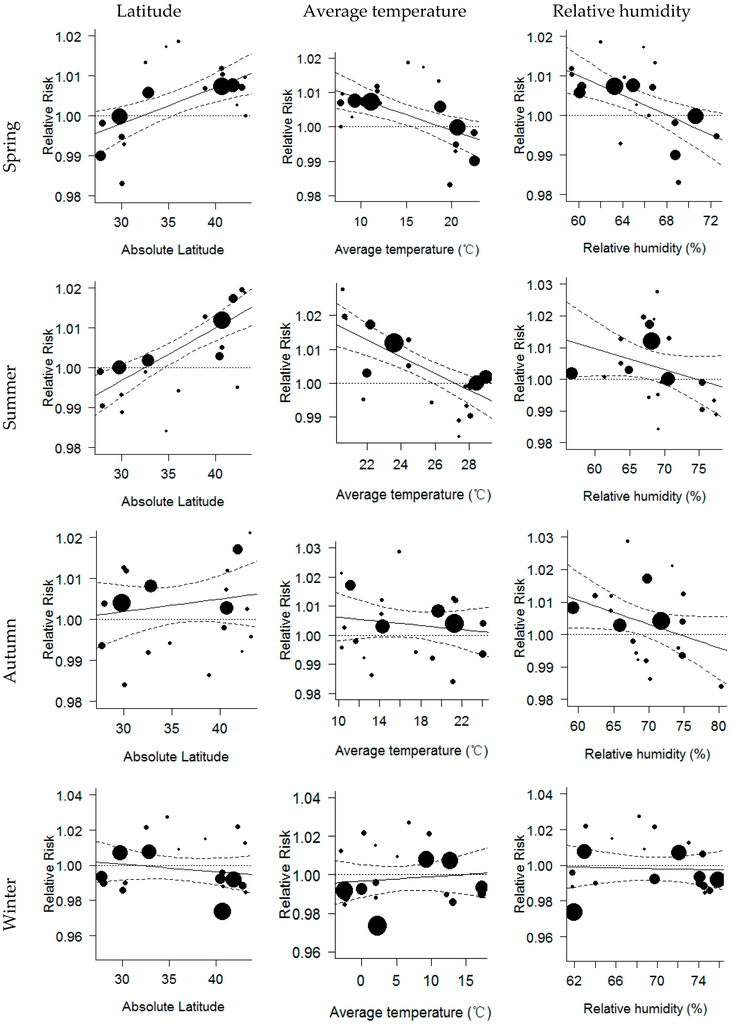 The meta-regression analyses show that city-specific latitude, TM and RH may be important modifiers of ozone effects on mortality. For example, in the spring season, the ozone effect was positively related to latitude increase (β = 0.09, 95% CI: 0.04 ~ 0.14), and negatively related to TM (β = −0.09, 95% CI: −0.15 ~ −0.03) as well as RH (β = −0.11, 95% CI: −0.20 ~ −0.05) in all communities. Similar results were also found in the summer and autumn seasons. However, in the winter season, reverse results were found. The ozone effect was negatively related to latitude increase (β = −0.04, 95% CI: −0.15 ~ 0.07), and was positively related to TM increase (β = 0.02, 95% CI: −0.07 ~ −0.12) in all communities, but these relationships were not statistically significant (Figure 3 and Table S2).