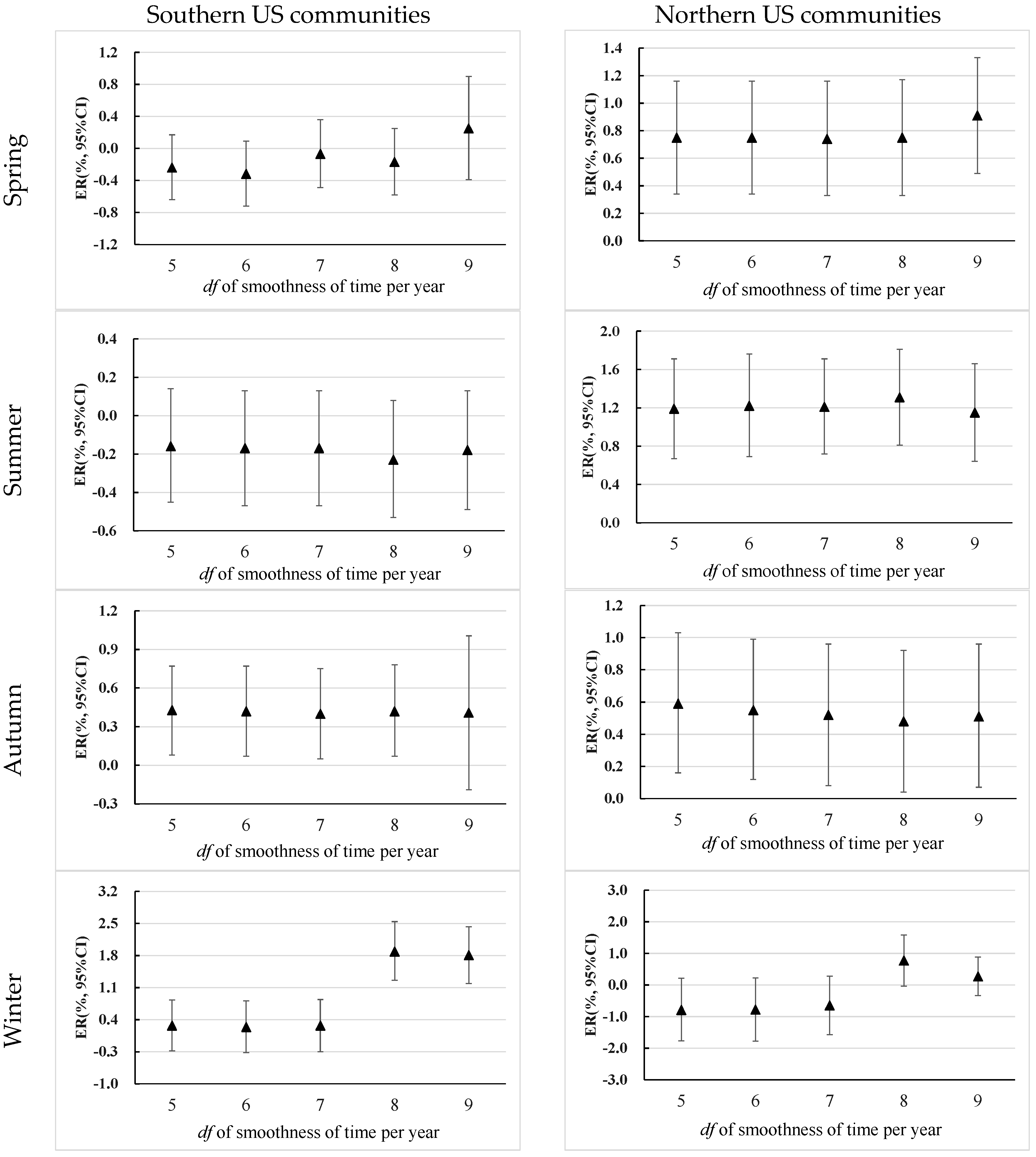 Sensitivity analyses indicate that the results were generally robust to changing the df of smoothness of time per year, but there is an exception (Figure 4). In the analysis that examined the effect of ozone on mortality in the winter of southern communities, the ER for each 10 ppb increment in ozone concentration significantly increased from 0.27% (95% CI: −0.15% ~ 0.07%) to 1.89% (95% CI: 1.26% ~ 2.54%) when changing the df from 7 to 8 per year. However, the ER did not change significantly when changing the df of time in the range of 5–7 per year. We did not find significant changes of ozone effects when altering the lag days of ozone exposure (lag0-1, lag0-2 and lag0-3), either. We observed similar seasonal and regional patterns of ozone effects in the communities with the maximum concentrations at both northern and southern regions. For example, a significant effect of ozone on mortality was observed in the autumn season of Dallas (southern community) and in the summer season of Washington (norther community) (Table S3).