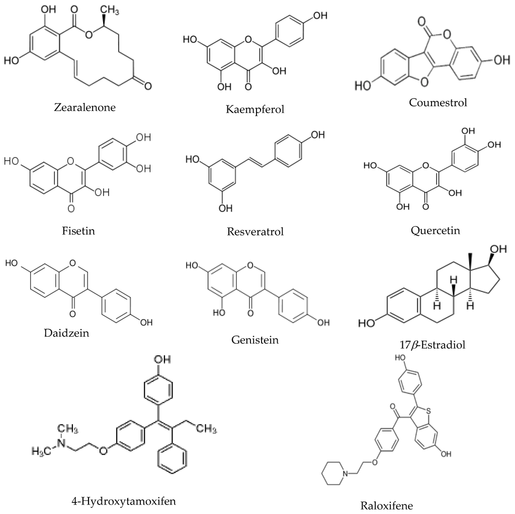 Estrogenic chemicals can have varied impacts on human health. Phytoestrogens belong to a class of plant secondary metabolites which are quite popular as alternative medicines for many diseases, even though controversial views about their benefits exist. Mycoestrogens are natural estrogens produced by fungi and are thought be to harmful to animals when consumed in contaminated feed. These groups of chemicals are regarded as exogenous estrogens of environmental origin that can alter an organism or disrupt the reproductive system by mimicking the actions of endogenous hormones. Plant-based therapies, which basically rely on the use of phytoestrogens to treat menopausal symptoms, have been observed to associate with modest symptom reduction in women []. It has been generally accepted that there are three major classes of phytoestrogens: Isoflavones, coumestans, and lignans []. For example, isoflavones have been characterized to have antimicrobial, anticancer, antioxidant and anti-inflammatory properties for disease treatment. However, it is also observed that isoflavones could possibly induce carcinogenesis, which leads to the concern of careful phytoestrogen usage for disease treatment and control of dietary intake due to the potential risk weighing over benefits []. Among various estrogenical chemicals, kaempferol has been shown to be a promising antioxidant and may reduce the risk of certain cancers [,,]. For quercetin, on the other hand, it has been suggested that “no reliable clinical evidence supports quercetin can prevent or treat cancer in humans” []. However, quercetin has been classified as an antioxidant in many studies and may be beneficial to treat inflammation and boost immunity [,]. In preclinical studies, fisetin has been proven to inhibit cancer cell growth and show no toxicities to normal cells []. The neurotrophic, anticarcinogenic, and anti-inflammatory properties of fisetin have led to interest in using it as a dietary antioxidant to promote health []. Resveratrol could potentially act through multiple mechanisms to prevent cancer and has been regarded as a promising anti-cancer agent []. Coumestrol has been shown to suppress cancer cell proliferation [] and exhibit various effects in reproductive system, the skeletal system and nervous system [,,]. Zearalenone can cause breeding problems, infertility, and abortion in livestock as an estrogenic mycotoxin and endocrine disrupter []. As the literature allowing one to arrive at conclusions regarding phytoestrogen safety and benefits is still incomplete, more studies are needed to elucidate the molecular mechanism of phytoestrogen functions.