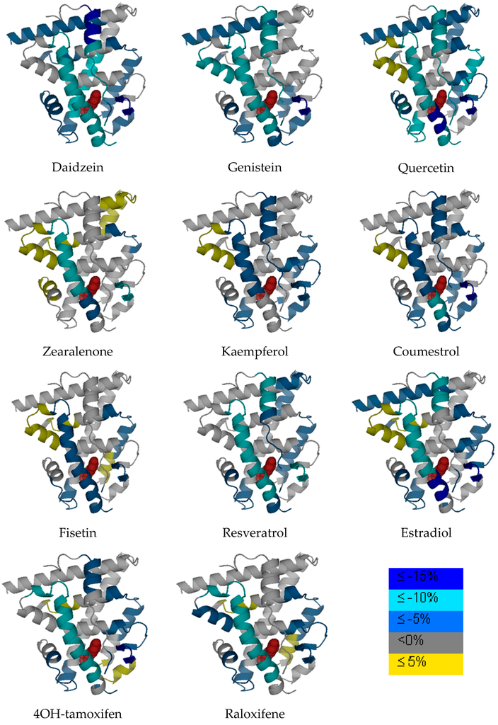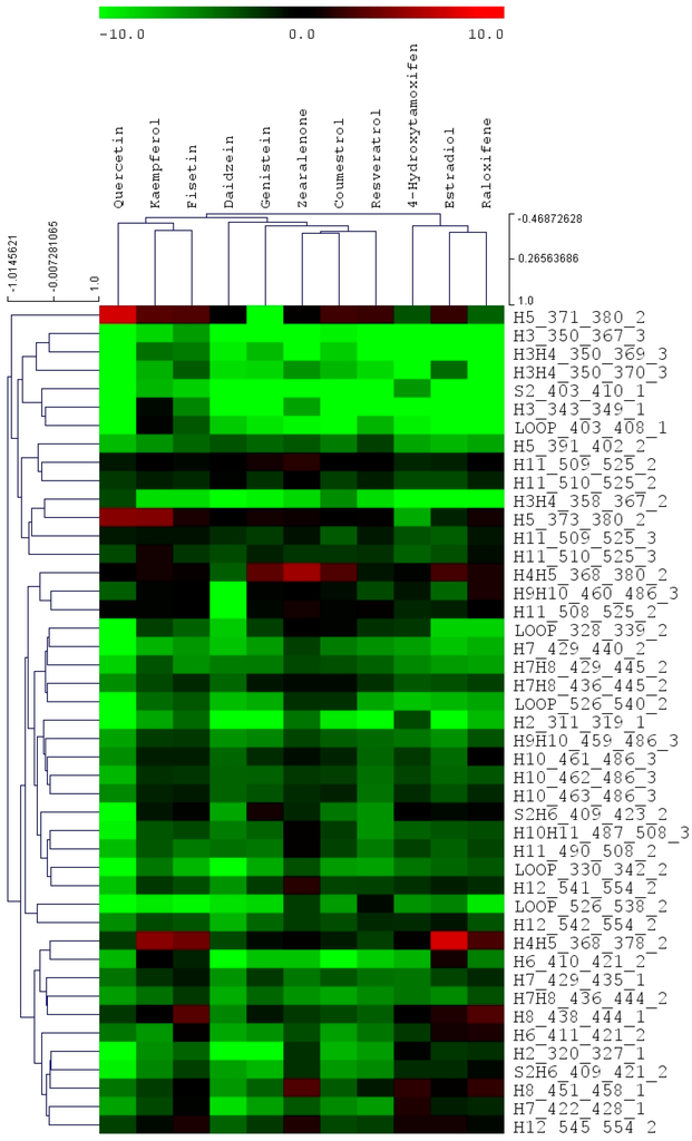 Surveyed in the current study includes a wide classification of chemicals that belong to different structure groups, and include steroid (i.e., 17β-estradiol); flavonoids such as isoflavones (i.e., genistein and daidzein), and flavonols (i.e., quercetin, kaempferol and fisetin); coumarins (i.e., coumestrol); mycoestrogen (i.e., zearalenone), stilbene (i.e., resveratrol and 4-hydroxytamoxifen) and benzothiophene (i.e., raloxifene). In the current HDX experiments, a slightly different set of ER digested peptic peptides were observed and analyzed in the final HDX analysis due to the new digestion conditions (i.e., different pepsin column, different protein/pepsin column incubation time, etc.). Interestingly, in our HDX profile cluster analysis, estradiol and the SERM molecules are classified into one group, while the phytoestrogens and mycoestrogens are more closely clustered to each other. This reveals the potentially unique ER/ligand conformation patterns in which phytoestrogen and mycoestrogen/ER ligand complex may possess, compared to estradiol and SERMs. The different conformation changes could lead to different mechanism by which phytoestrogen and mycoestrogens function in cellular and animal models.