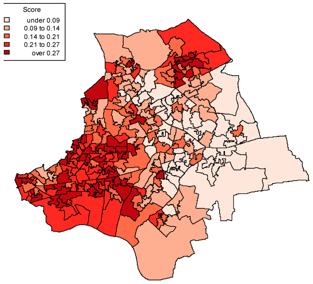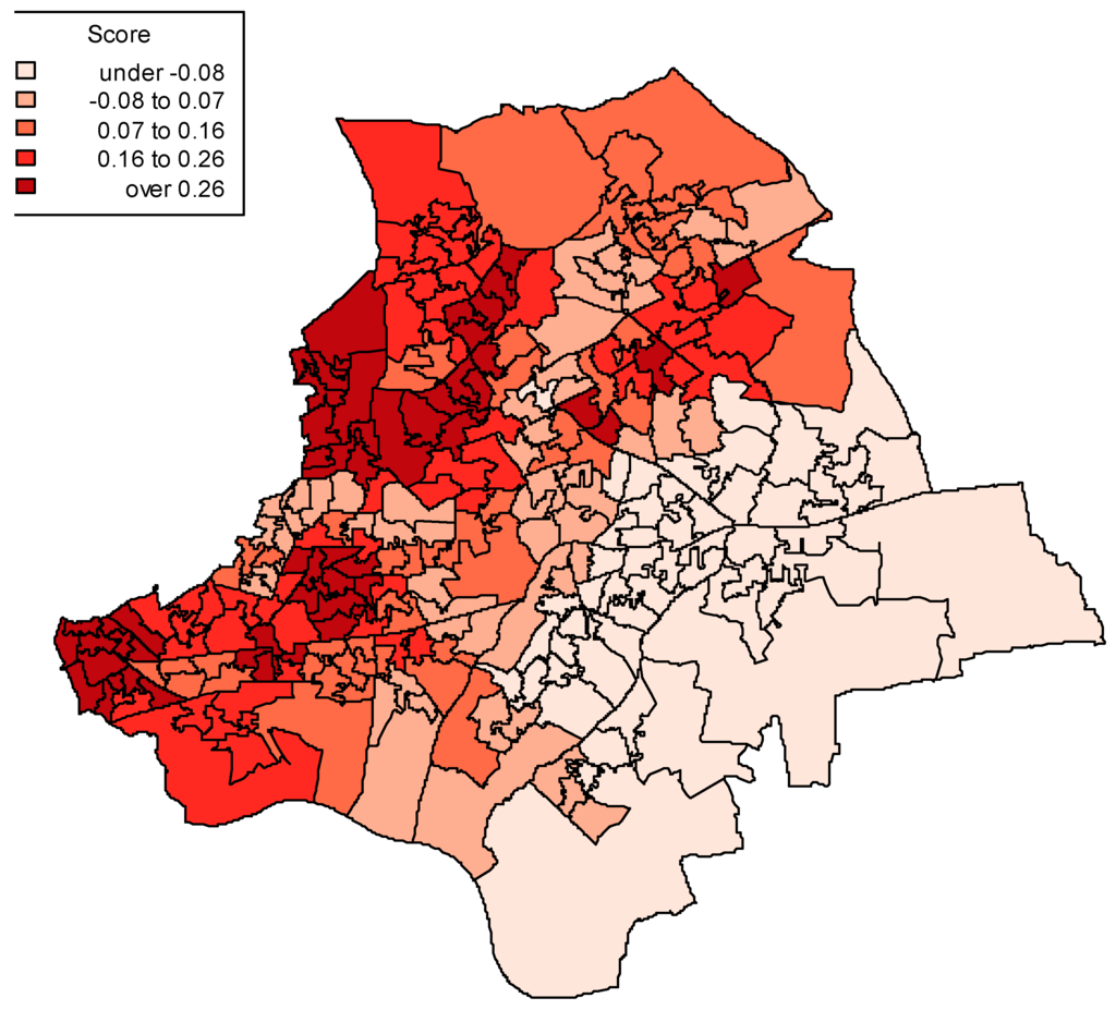 Figure 4 accordingly maps out access scores for the 260 neighbourhoods (LSOAs) using the posterior mean G scores for GP practices, and shows clear geographic clustering of poor access. An accompanying map (Figure 5) shows LSOA scores for income deprivation, and associations between the geographic patterns of deprivation and poor access are apparent.
