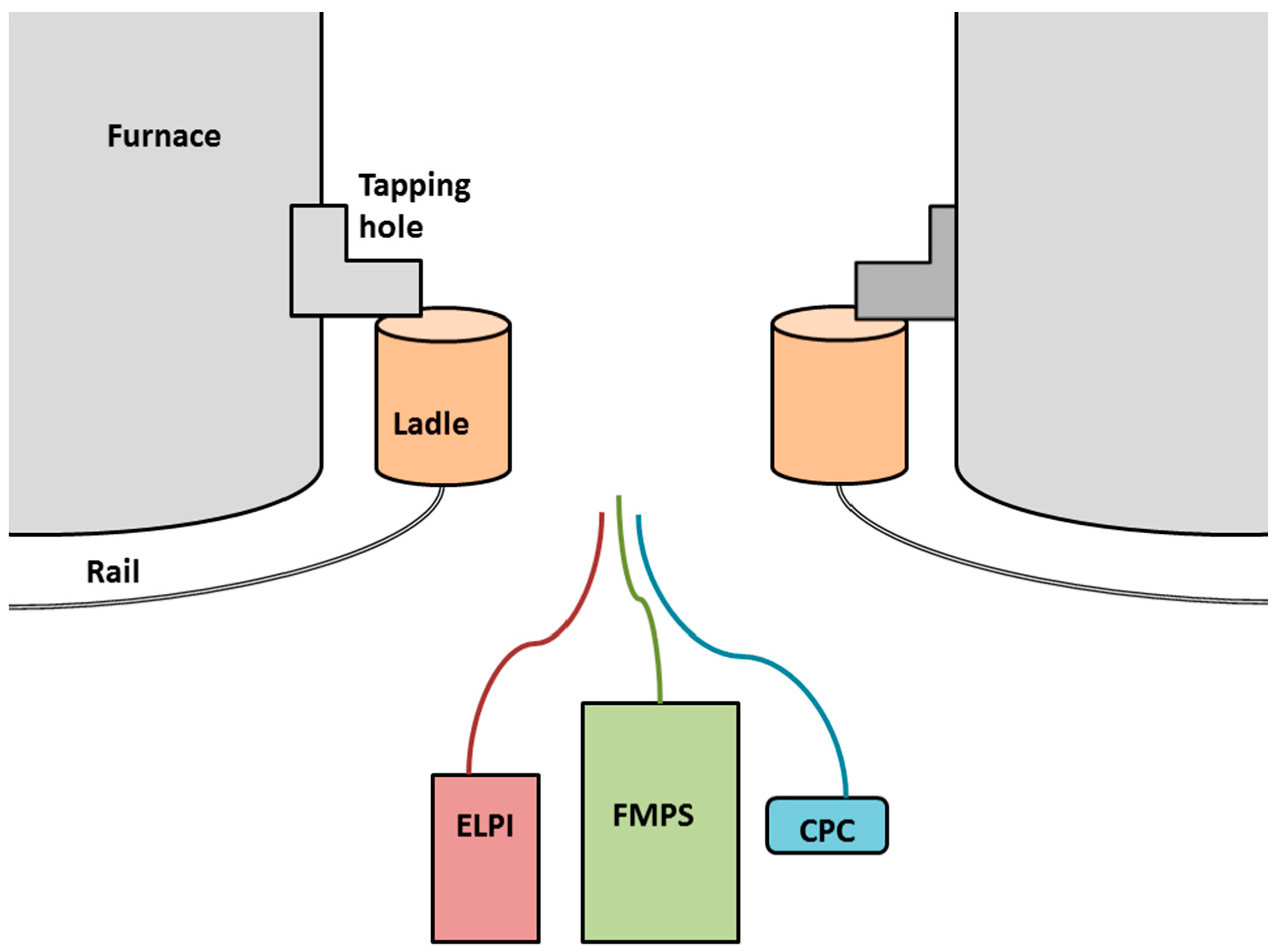 The instruments were set up approximately 15 m from the ladles in the furnace tapping area between two continuously tapped furnaces; Figure 1 shows a schematic illustration of the instruments’ position. In the large hall behind the two furnaces, other PM-generating operations such as refining and casting took place.