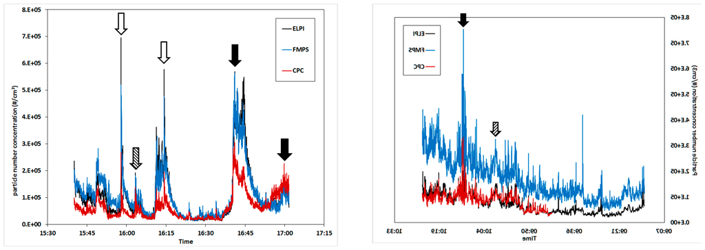 PM concentration as a function of collection time from the two different days of measurement. CPC, FMPS, and ELPI are compared and PM-increasing events are market by arrows. Results from day 1 are shown to the left, day 2 to the right.