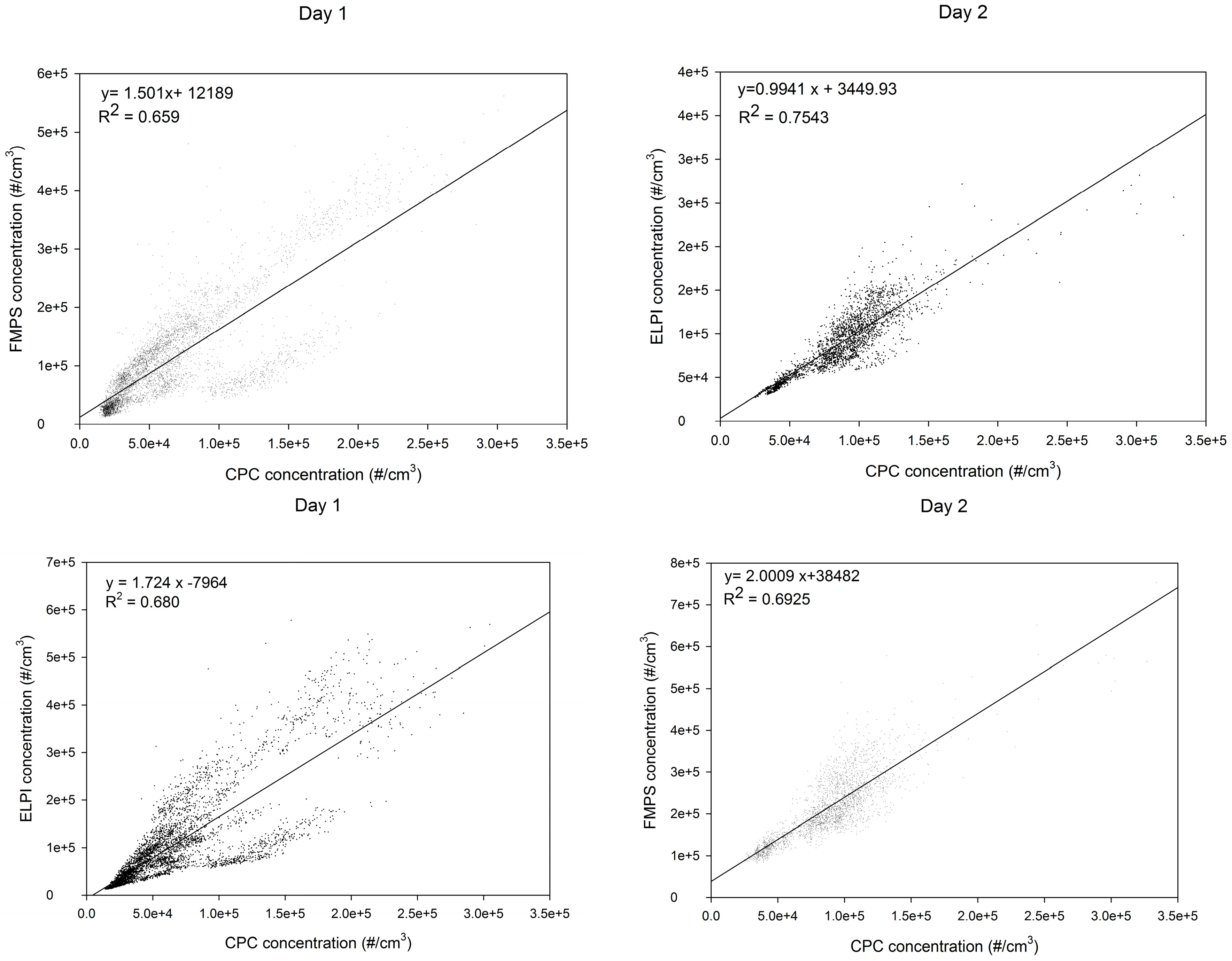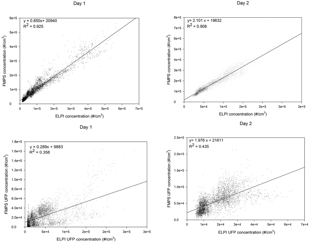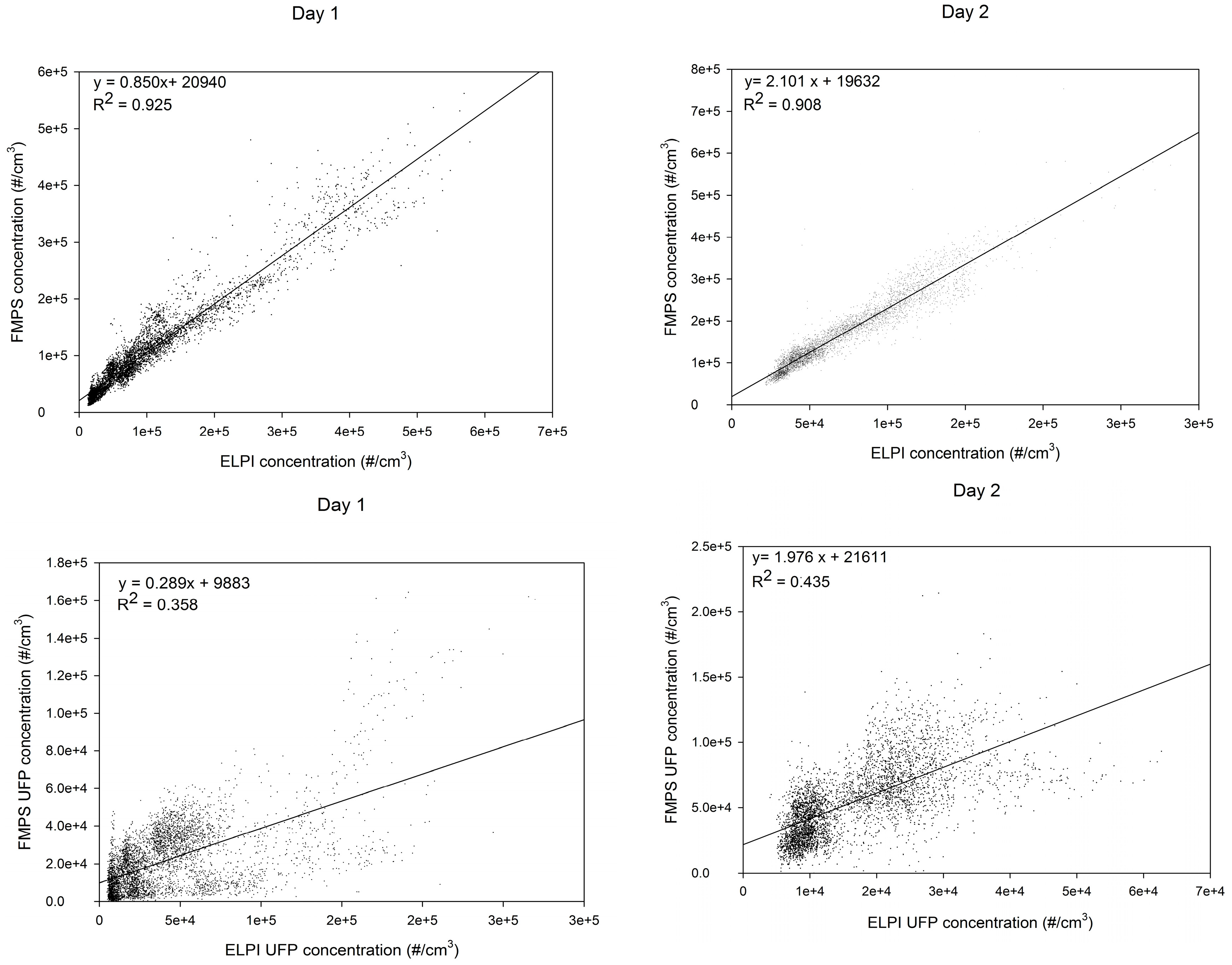 Figure 3 shows scatterplots together with regression analyses between the instrument results. The correlation between ELPI and FMPS is very good on day 1, and on day 2 the FMPS seems to measure high concentrations (by a factor of two) as discussed before. Between the ELPI and CPC the best correlation was found on day 2. For the ultrafine fraction of the ELPI and FMPS, the correlation is insufficient, which is further discussed below. The correlations were confirmed by Spearman’s rank correlation coefficient, which showed a correlation of FMPS to ELPI of ρ = 0.959 (Figure 2, left: day 1) and 0.957 (Figure 2, right: day 2), respectively. The correlation between the CPC and the other two instruments is lower; for FMPS to CPC, ρ = 0.814 (day 1) and ρ = 0.666 (day 2). For ELPI to CPC, ρ = 0.882 (day 1) and ρ = 0.862 (day 2) and for ELPI UFP to FMPS UFP, ρ = 0.541 (day 1) and ρ = 0.715 (day 2). ELPI UFP compared to FMPS UFP concentrations are shown in Figure 6.
