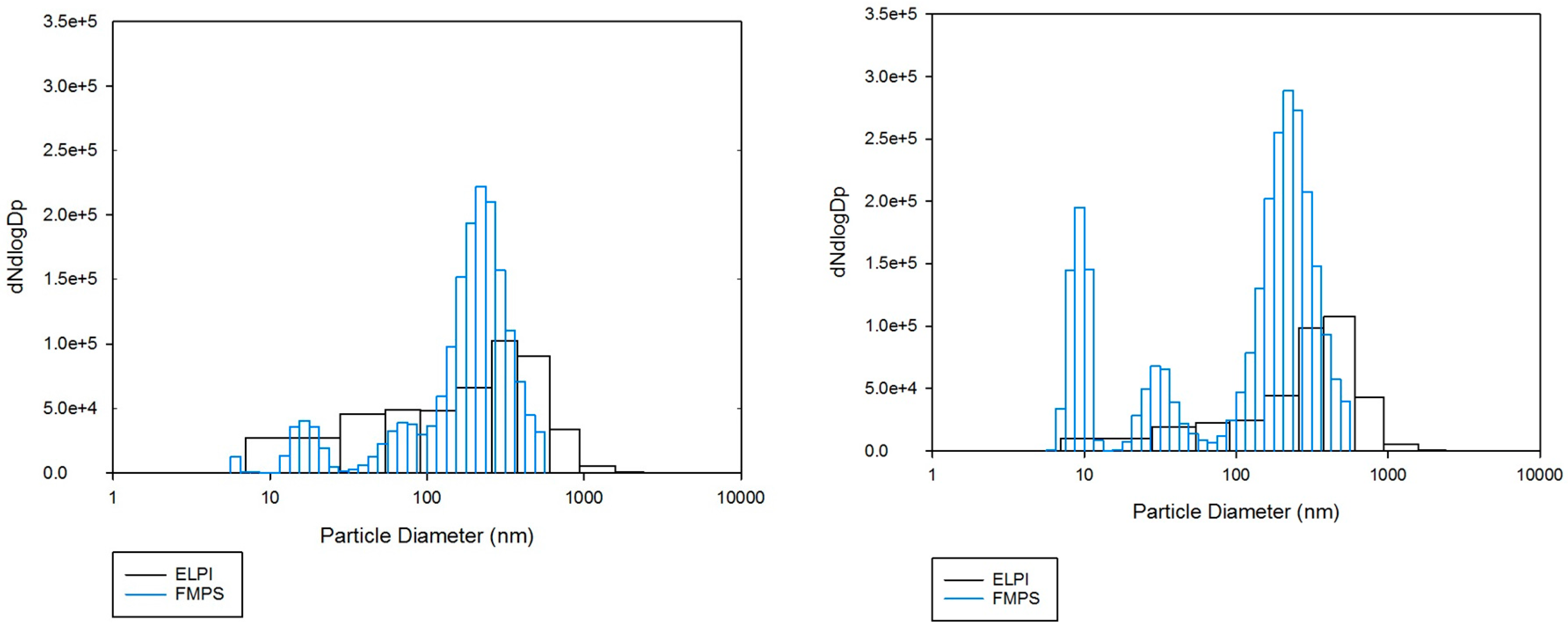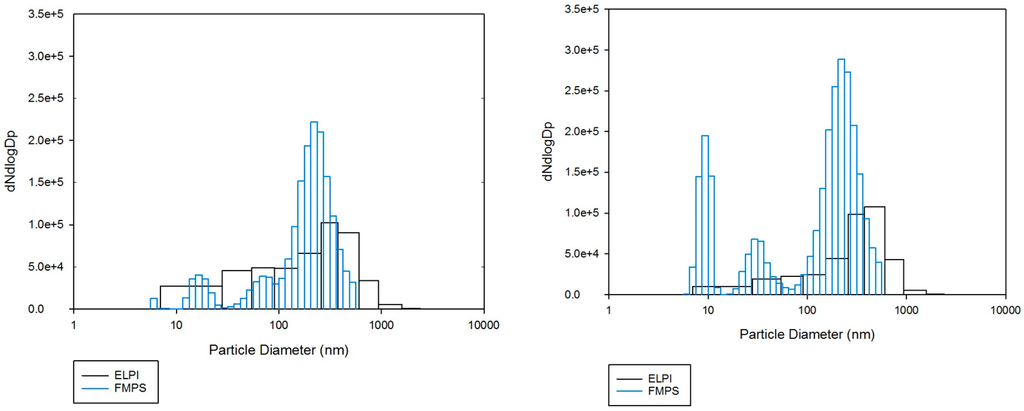The particle size distributions as obtained by the ELPI and the FMPS are shown in Figure 4. The size intervals of the ELPI are much wider than those of the FMPS, which results in a low resolution particle size distribution. The greater resolution of the FMPS is a significant advantage, as it allows detailed information about the size distribution even for ultrafine particles. The FMPS results show a tri-modal particle size distribution, while the ELPI results appear as a simple distribution, with only one mode.
