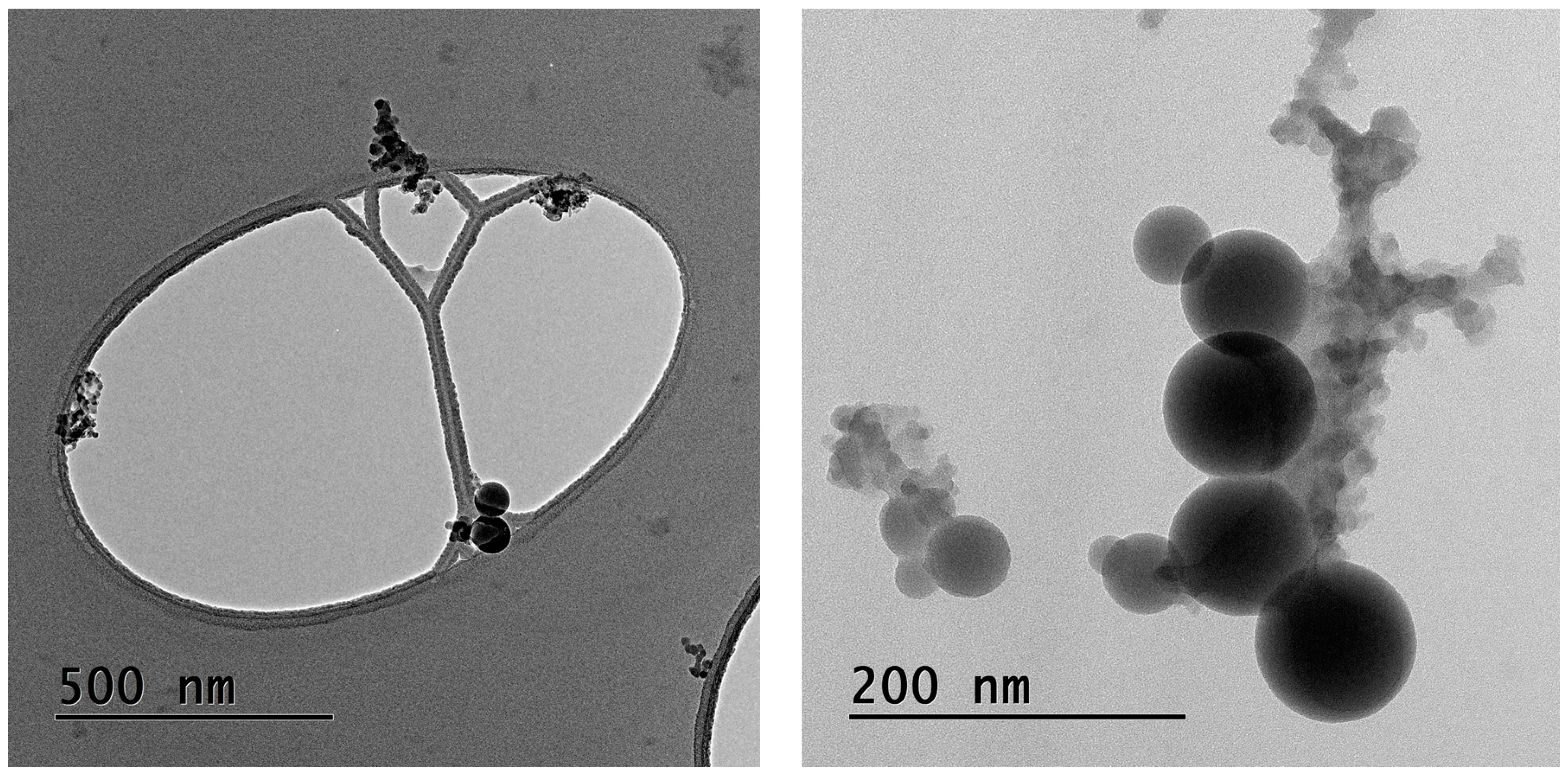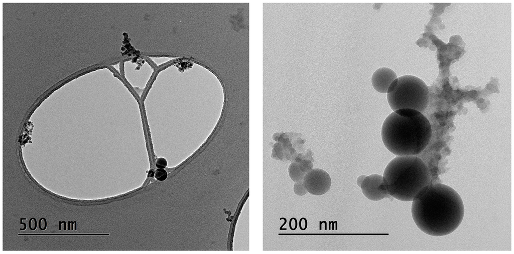 Figure 5 shows transmission electron micrographs of the PM collected by the ELPI in the second smallest size fraction (Dp 28–54 nm). In Figure 5 (left), the magnification is relatively coarse and the holey carbon film of the sample holder is seen as the egg-shaped hole. The particles collected on the film are agglomerates of different shapes and consist of amorphous silica, very similar to findings reported by others [2,3,24,25]. As seen in Figure 5 (right), with larger magnification, the protoparticles are spheres and the transitions between the smallest protoparticles appear blurred, which indicate that they are undergoing a sintering/coalescing process. These agglomerates are therefore likely to be primary agglomerates.