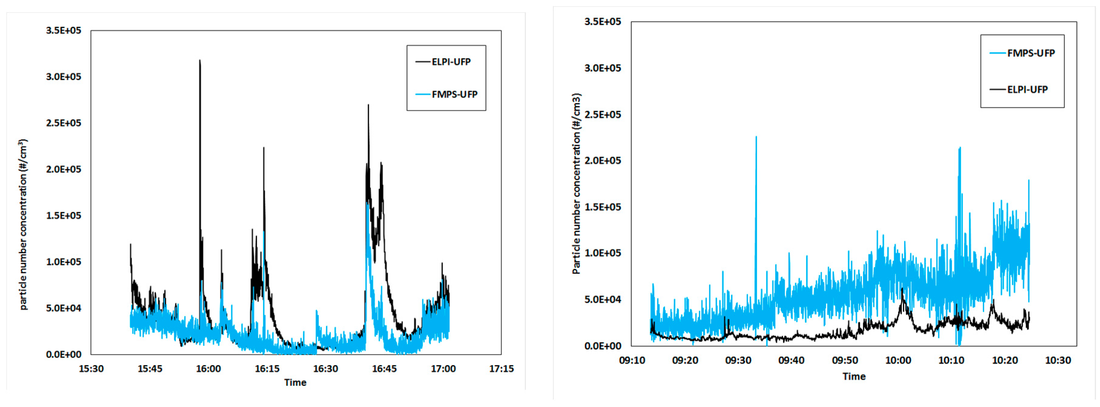 The FMPS measurements were performed by use of the instrument software Fast Mobility Particle Sizer Software version 3.1.1. The software considers the dilutor, and the measurements are automatically recalculated to the correct concentrations. The UFP number concentration is calculated in Microsoft Excel as the sum of particles of the first 20 channels, resulting in the particle concentration of 5.6 nm–100 nm (named FMPS-UFP). The total number concentration within the size range of 5.6–560 nm was calculated and named FMPS. For the ELPI, only the collection from the size fractions with Dp < 0.6 µm were used for comparison with the other two instruments; this concentration range is henceforth named ELPI. The UFP number concentration was calculated as the sum of the particles of the first three size bins (7–91 nm) and named ELPI-UFP. In the data treatment for ELPI, the particles were assumed to have a uniform density (1 g/cm3); this assumption is discussed below. The software used was ELPIvi version 4.0 and Microsoft Excel with a macro supplied by the producer (Dekati Ltd.).