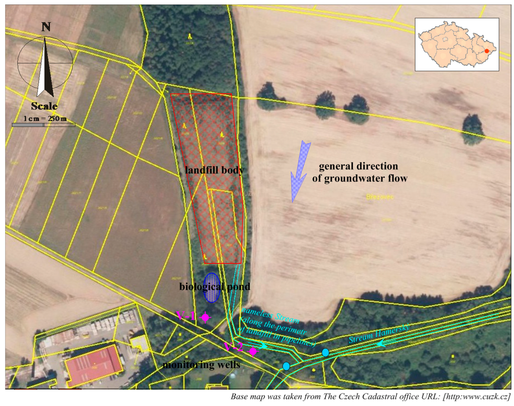 3) was deposited here. A building permit for the reclamation of the landfill had been issued in 2000, and it was completed in 2004. The landfill surface is levelled, compacted, and covered with fine-grained material. A PEHD foil, protected by geo-textile material on both sides, is applied on the levelled surface, as well as a drainage layer and soil layer with the thickness of up to 2 m. The surface is covered with tree plants. There is no degassing device in the landfill due to the nature and amount of waste. There is a bio-pond built in the landfill as part of the landfill technology for self-cleaning of leachate and rainwater. The bottom of the pond is covered with a foil, and the leachate from the landfill and rainwater from the peripheral ditches are discharged into this pond. There is an unnamed stream flowing through a pipeline below the landfill body, which leads to an already open stream bed below the landfill at the mixed water mouth from the biological pond. After about 50 m, the inflow leads into the Hamerský Stream. The Hamerský Stream flows into the Rožnovská Bečva River after 1 km. See