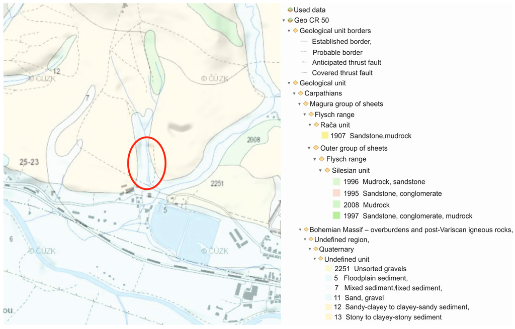 According to the regional hydro-geological zoning of the Czech Republic, this area belongs to the group of flysch sediment zones, sub-zone of the base layer of no. 3221 flysch in the Bečva river-basin, occupying an area of 1291.56 km2. There is an unrestricted divisible collector within the zone, and it is tied to the environment of claystones and marlstones with free groundwater surface with predominant interstitial-fissure permeability. A continuous shallow quaternary aquifer is tied to interstitial permeable quaternary gravel sediments of the alluvial plain and clayey-rocky slope sediments. The permeability of soil varies considerably depending on the content of clay, sand, and gravel. The groundwater surface is shallowly locked below the terrain, it is free and its slope conforms to the terrain slope. The shallow quaternary aquifer groundwater drains to the Hamerský Stream, which forms the local drainage base. The subsurface flysch rocks, respectively their near-surface fissured and soft area represent, from the hydro-geological point of view, a regional insulator with increased permeability only in this near-surface soft zone. The transmissivity is low or even very low.