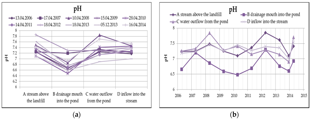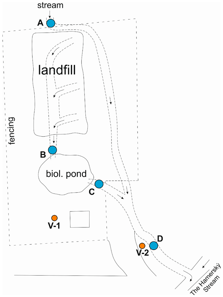 The results of a long-term monitoring of ground, surface, and leachate water in the area of interest do not clearly show any relevant burden of the surrounding environment having a long-term and serious effect on the current level of quality of the Hamerský Stream and, respectively, its unnamed right-hand tributary. The potential source of pollution—Hamra landfill—has currently been reclaimed, surface-sealed, and planted. Leachate from the internal drainage system and rainwater from the peripheral drainage system are discharged into the biological pond, which functions as a mean of natural degradation of pollutants. A comparison of the quality of surface water at the inflow and outflow profile cannot unambiguously confirm the negative effect of the landfill body, the water quality is comparable. There are other anthropogenic activities in the area of interest that decrease the quality of surface water (agricultural activity in the vicinity), and there is also the possibility of increased geochemical background, especially in the form of mercury contents.