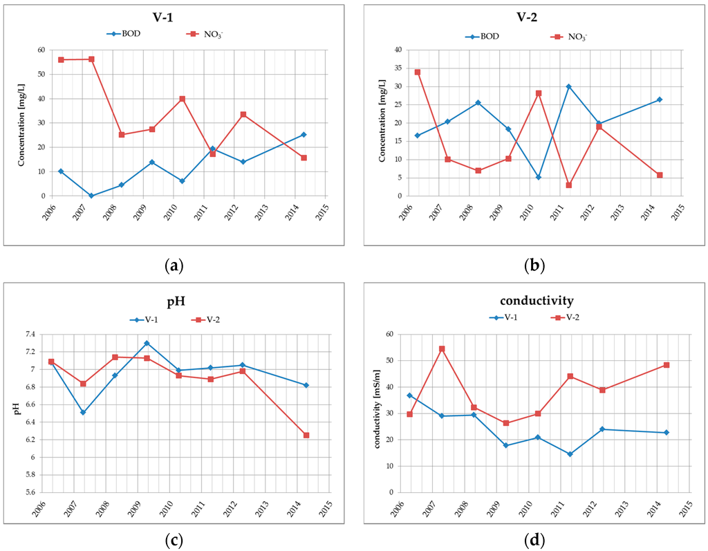 Groundwater quality at the site is monitored in boreholes V-1 and V-2, which are located at the landfill drainage profile. The results from the years 2006–2014 (see