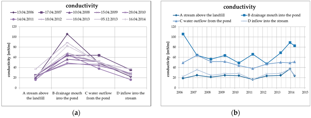 Figure 5 presenting the specific conductivity values of surface water at the individual monitored profiles, including the long-term trend.