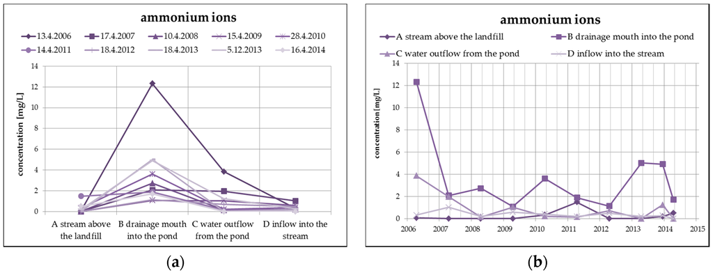 Figure 7. The highest concentration of ammonium ions in surface water from the monitored number of profiles is found in profile B (leachate outflow), while the concentration of nitrates is the lowest. However, a reduced concentration of ammonium ions with a simultaneous increase of nitrates can be observed at the outlet of the pond (profile C).