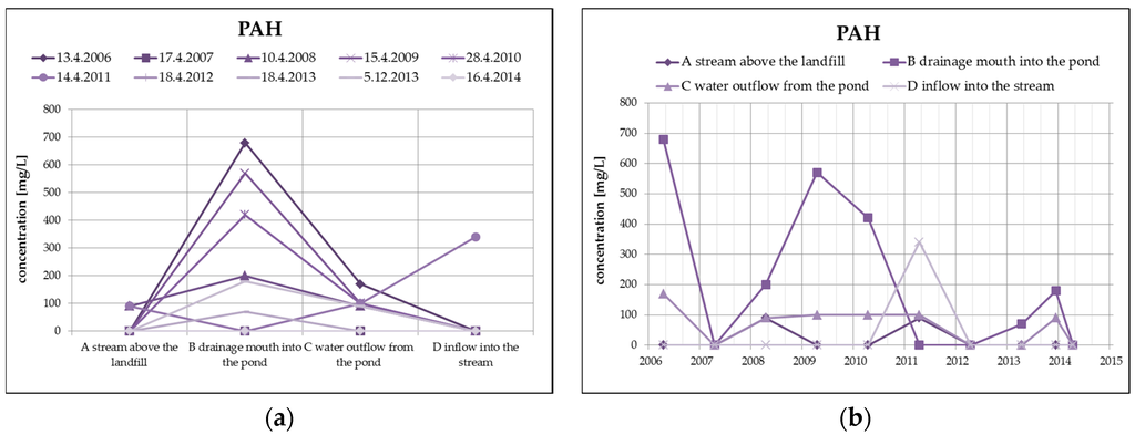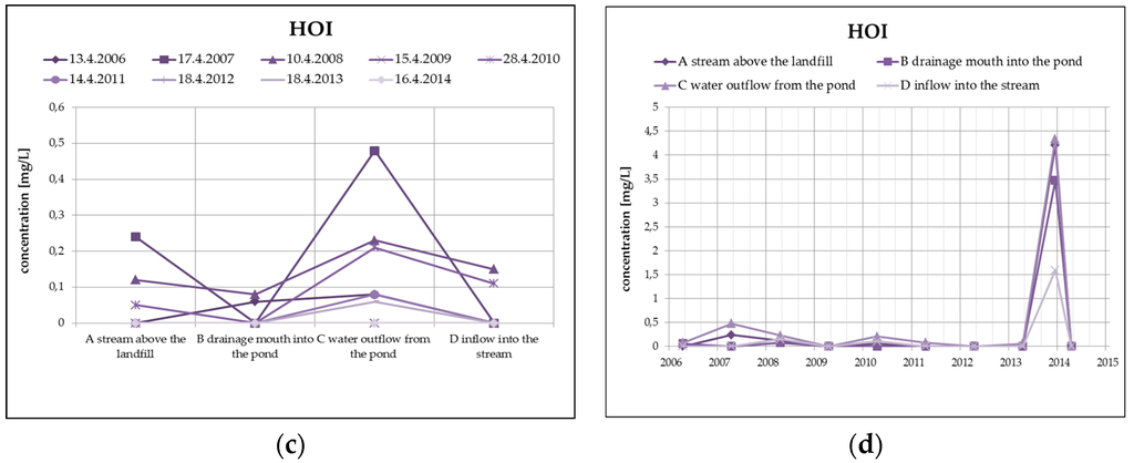 The quality of surface water in profile A, which represents the unaffected environment, has been relatively stable since 2006, with low specific conductivity content (specific conductivity ranges up to 25 mS/m), the water reaction is neutral to slightly alkaline (pH = 7.1–7.8). The contents of ammonium ions and nitrates in increased concentrations occur only sporadically, from heavy metals, only Hg exceeds the detection limit with the maximum of 0.0002 mg/L. This section may be divided by subheadings. It should provide a concise and precise description of the experimental results, their interpretation as well as the experimental conclusions that can be drawn. The values of organic substances represented by the COD and BOD parameters, with maximum values of COD = 84 mg/L and BOD = 22 mg/L, have increased as well. PAHs are virtually absent in surface water in this profile, HOI oil products have been verified with a maximum value of 0.24 mg/L.