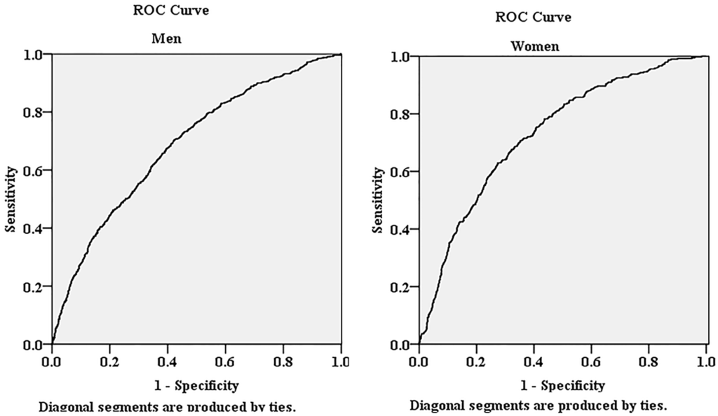 Figure 3 showed the AUCs (and 95% CIs) of AIP in the prediction of HUA. The AUC was 0.686 (95% CIs: 0.665–0.707) for male and 0.730 (95% CIs: 0.706–0.755) for female.