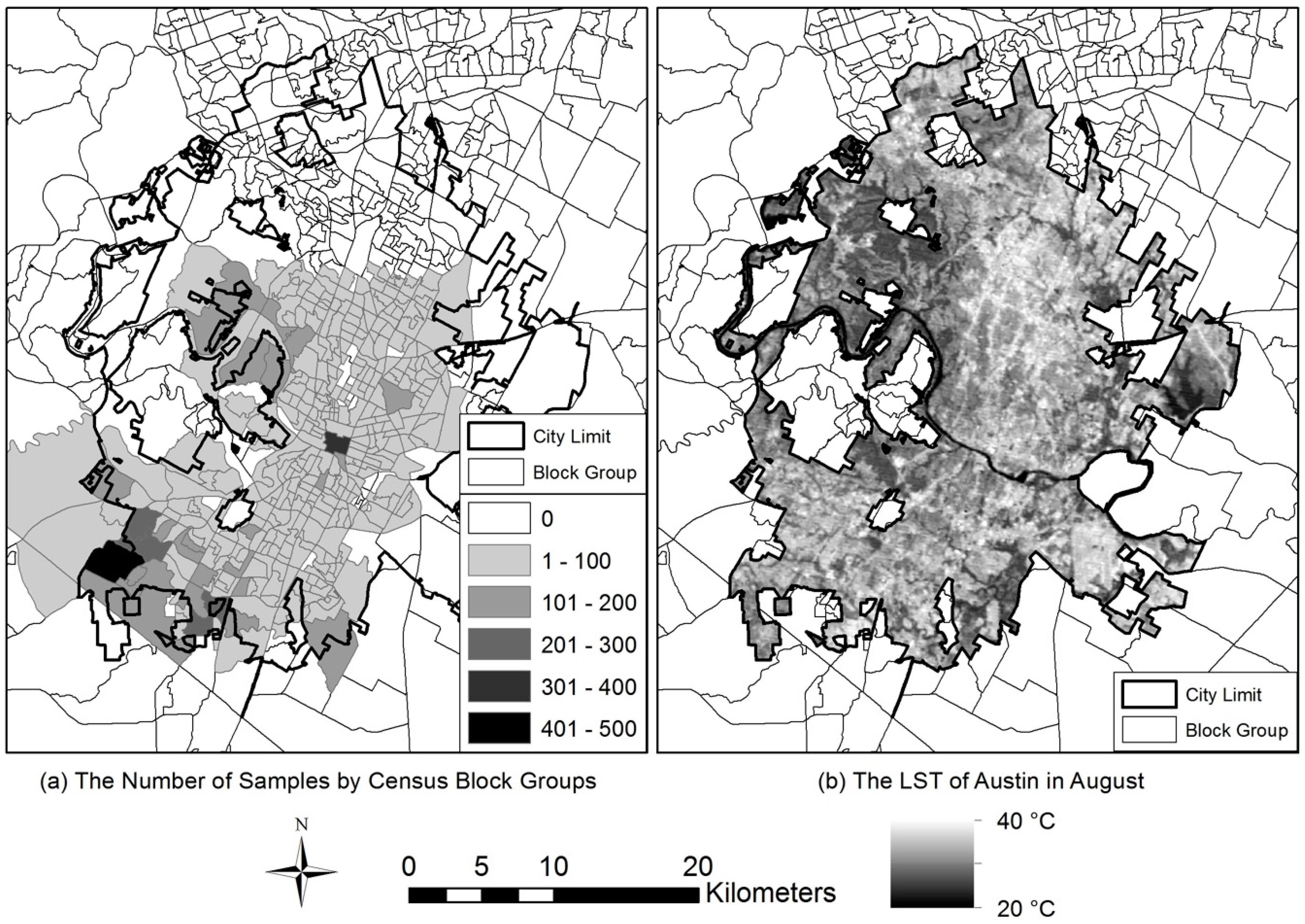 We initially collected 31,670 residential parcel data in Travis County from the Multiple Listing Service (MLS) data provided by the Austin Board of Realtors®. From the full dataset, this research eventually selected 15,862 samples of single-family homes after excluding 15,808 samples. Those samples were excluded because they did not show geo-reference points to locate the neighborhood in geographic information systems (GIS) analysis and were listed as multi-family properties. Figure 1 shows: (a) the distribution of the final sample at the census block groups, and (b) the distribution of LST on the research area location in August. The samples were distributed over most urban areas in Austin. The housing density of the study area is 484.06 housing units per one square kilometer, and it is significantly higher than the average density (304.84) of other metropolitan areas in the U.S. The percentage of green space is 14.2% (109.65 km2), and it is 0.12 km2 per 1000 people. The LST varies within the study area by built and natural environments, and it follows the annual temperature range.
