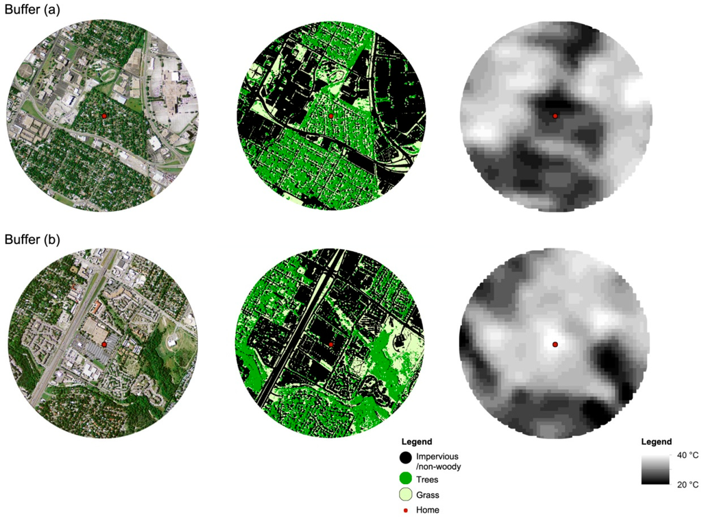 Examples of two buffers measuring LST and neighborhood landscape spatial patterns. (a) Example 1; (b) Example 2.