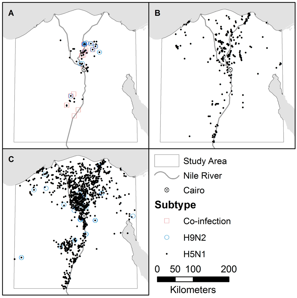 Strong evidence suggests aquatic birds act as the natural reservoir host for the influenza virus, and surveillance and intervention at the avian-human interface may be critical to the early identification and eradication of the next potentially pandemic strain [,]. Most human infections with avian influenza have been the result of direct contact with poultry, not wild birds, likely due to the much higher rate of contact []. The potential for direct contact between humans and poultry is high in Egypt. The majority of poultry production is carried out in commercial farms. Some 4–5 million Egyptian families raise poultry at home in traditional backyard flocks, accounting for roughly a third of poultry production in the country []. While commercial farms generally have high biosecurity limiting poultry contact with potentially infected wild birds, backyard farms are characterized by outdoor enclosures with little security. For example, a three-year study of backyard poultry growers in Egypt found that none of the participants (n = 750) consistently used or decontaminated personal protective equipment []. Egypt is an arid country in Northeastern Africa, containing just over one million square kilometers of land, of which less than 3% is arable, mostly located in the Nile River valley and delta []. Both human and poultry populations are most densely distributed in these arable regions [].