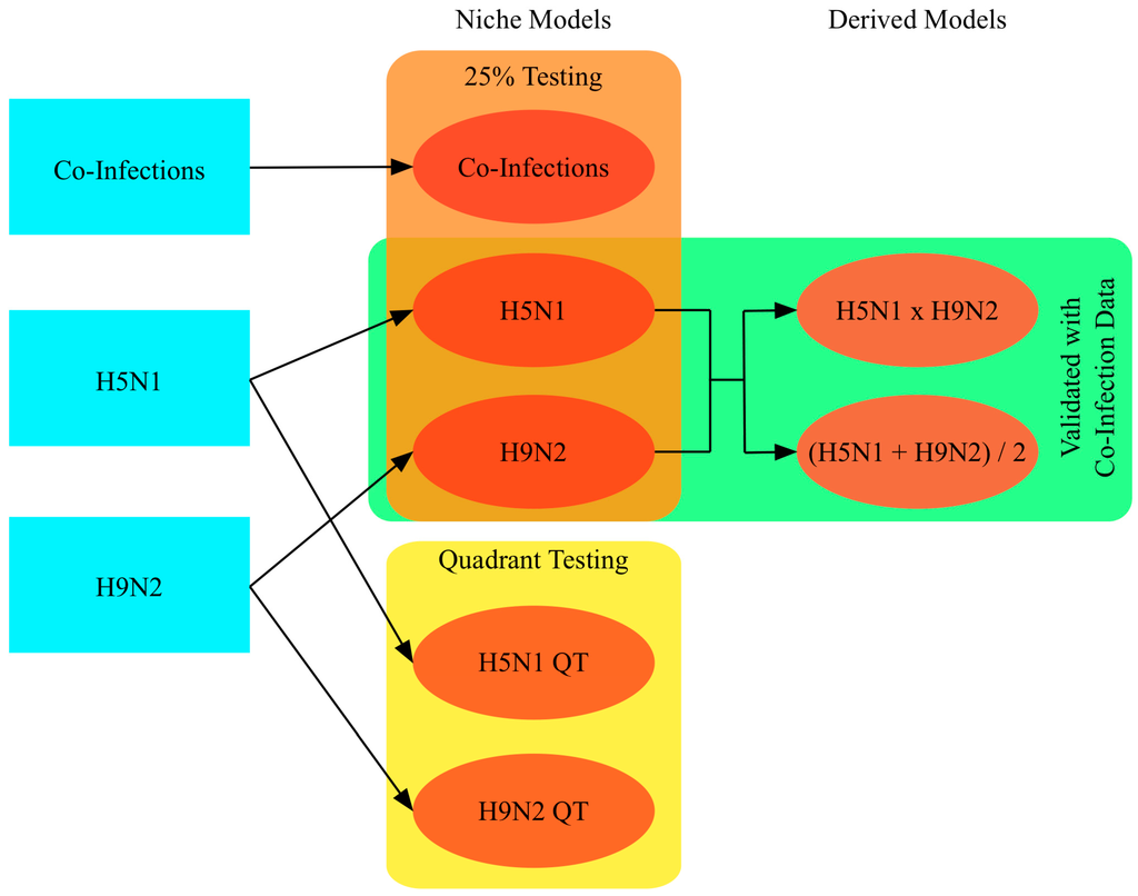 The AUC results for all of the models are reported in Table 3. The maps of co-infection potential created by multiplying and averaging the H5N1 and H9N2 niche estimates were evaluated using actual co-infection occurrences that were independent from the datasets used during training. The co-infection occurrences (n = 57) were used as presence locations vs. randomly selected background points in AUC calculations for the H5N1 niche, the H9N2 niche and the combined co-infection potential maps. The H5N1 niche had an AUC of 0.9276, the H9N2 niche had an AUC of 0.9379, and the H5_H9 niche had an AUC of 0.9918. Testing against co-infection occurrences, the H5N1 niche had an AUC of 0.9784 while the H9N2 niche had an AUC of 0.9923. The co-infection potential map using multiplication achieved an AUC of 0.9948, while the map using averaging of H5N1 and H9N2 achieved an AUC of 0.9939.