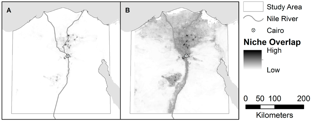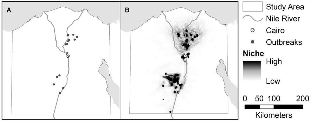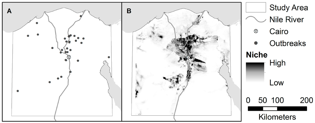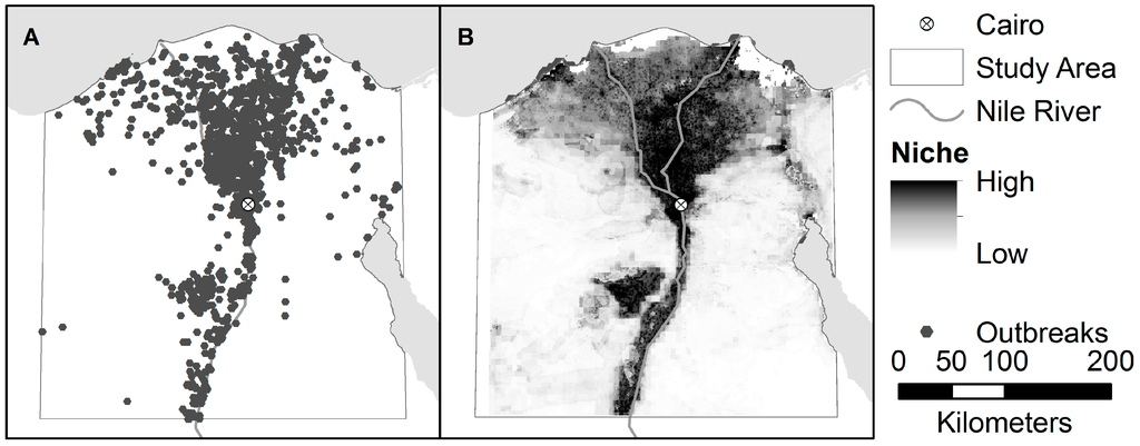 Ecological niche modeling (ENM) and the related species distribution modeling (SDM) were developed by geographers and ecologists to predict the potential geographic occurrence of organisms based on observed occurrences in niche space []. We define the niche as the combination of environmental conditions (here, these include host populations and indirect indicators) within which an organism can persist. ENM and SDM are sometimes used interchangeably; however, modeling the processes that shape distributions and predicting the potential distribution in unsampled areas assumes a niche-based hypothesis, so we will use the term ENM (for a detailed discussion, see [,], but also see [,]). ENM is only possible on a broad scale with the use of remotely-sensed datasets, which tend to have much higher spatial and temporal resolution than observational data, and cover a considerably larger spatial extent [,]. Remotely-sensed data allow detailed modeling across very large regions, including areas where more traditional observational data are not available or are severely outdated, a common problem in many developing countries, such as Egypt.