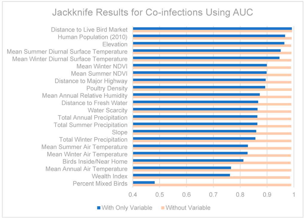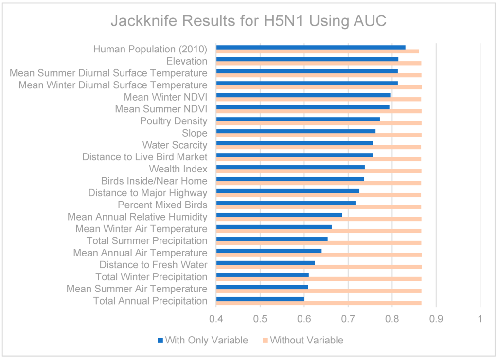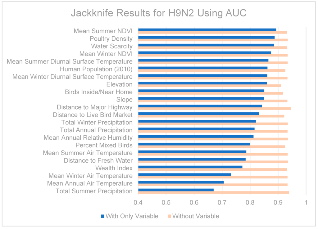 Jackknife tests are summarized in Figure 7, Figure 8 and Figure 9. The strongest single contributor to the H5N1 niche was human population, which was also the variable that caused the largest loss in AUC when it was removed from the model. Mean diurnal surface temperature (summer and winter), Elevation, and mean NDVI (summer and winter) were also strong contributors. For the H9N2 model, the strongest single contributor was mean summer NDVI, followed by Poultry density and water scarcity. The largest drop in AUC accompanied the removal of elevation from the model. The highest overall AUC for the H9N2 model was achieved by the full model after removing Distance to major highways. In both models, air temperatures, precipitation measurements, and distance to fresh water were generally poor contributors. The strongest contributor to the co-infection niche was distance to LBM, followed by human population and elevation. The largest drop in AUC coincided with the removal of the wealth index.