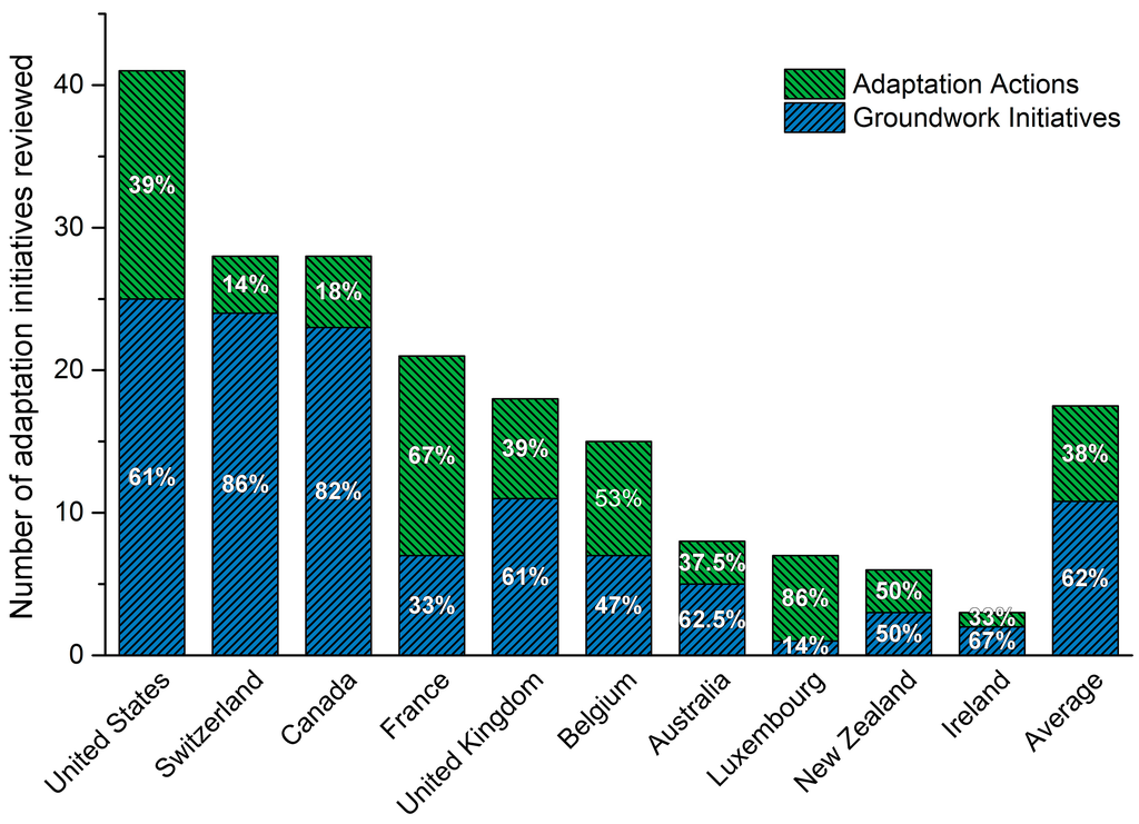 Percentage of groundwork initiatives and adaptation actions by country, and number of health adaptation initiatives identified by country.