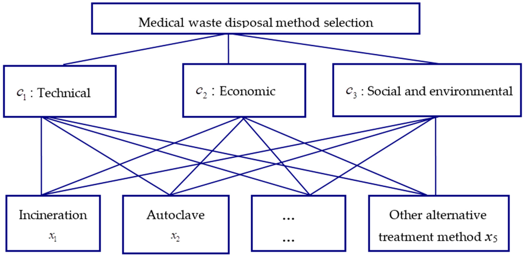 In this case study, five disposal methods are considered: incineration, autoclave, microwave, sterilization, and other alternative treatment methods, constituting the bottom alternative layer in the hierarchical decision structure in Figure 1. The middle layer furnishes the three evaluation criteria for the alternatives, consisting of technical, economic, and social and environmental considerations. The very top of Figure 1 signifies that the overall objective of this decision structure is to assist the selection of the best method to dispose medical waste.