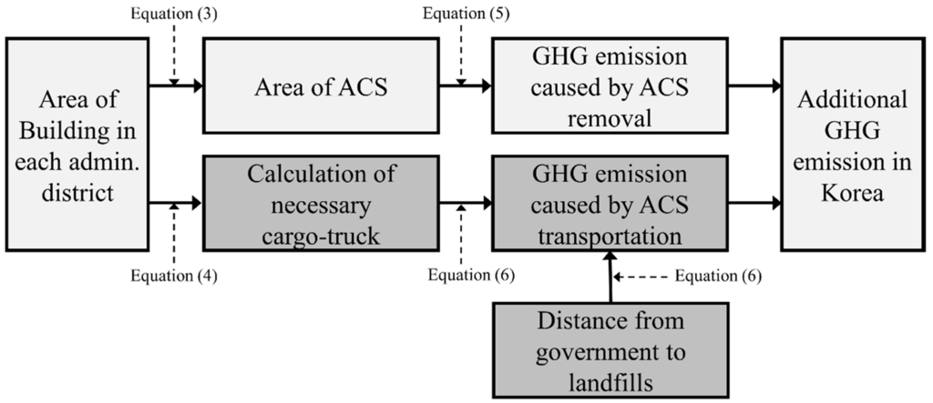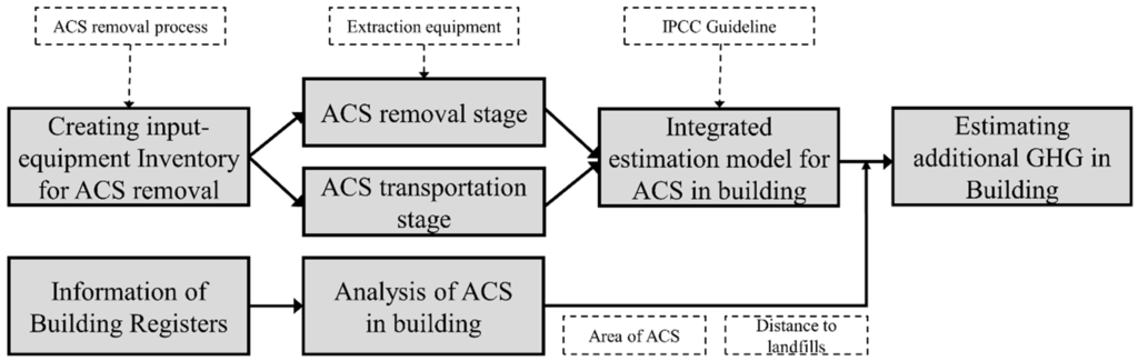 To achieve Objective 1, an integrated GHG estimation model was developed. First, regulations regarding ACS removal were considered and all removal processes were identified. An input-equipment inventory was created for each of the removal processes. Second, any equipment present in the inventory that is known to generate GHG emissions was assigned to one of two stages, removal stage or transportation stage, before defining its electricity and fuel consumption requirements and arranging the figures a database (DB). Third, an integrated estimation model was developed by applying the IPCC GHG calculation method to both the removal and transportation processes, and then summing them together. To achieve Objective 2, the total GHG emission generated by ACS removal was calculated for all of the buildings in Korea using the integrated estimation model developed in Objective 1. First, all buildings containing ACS were identified in each local governing unit using the building register. Second, the total area and weight of all ACS in each local governing unit was calculated, in addition to the total distance to landfills. The resulting values were compiled for all local governing units and applied as inputs into the integrated estimation model.